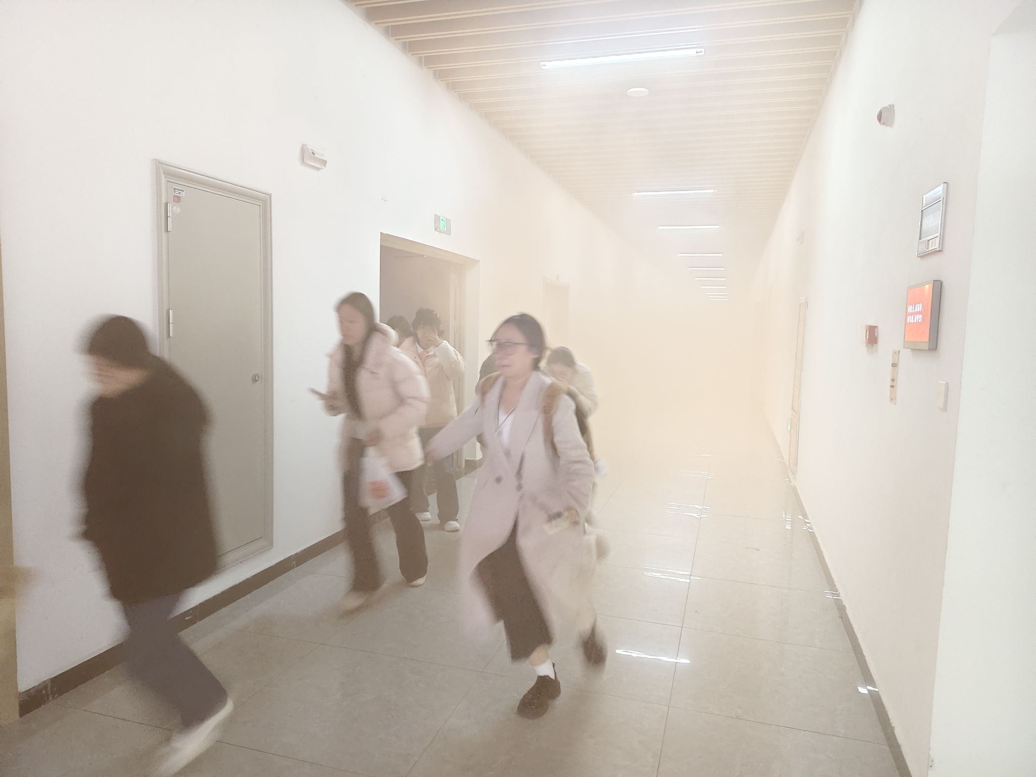 总指挥下达开始命令后,1号教学楼A楼一层发生火灾,烟雾迅速扩散,临近的老师迅速按下手动火灾报警按钮发出火警信号,并通知班级的学生:“一楼发生火灾,全楼人员立即疏散!”此时,学校巡逻队保安人员迅速赶至教学楼,与辅导员老师一起组织引导学生疏散,边组织疏散边引导:“不要拥挤和大声说话,遇到烟火,屈伸弯腰保持低姿前进,用打湿的毛巾或湿纸巾捂住口鼻,不要穿过火焰,保持冷静!”