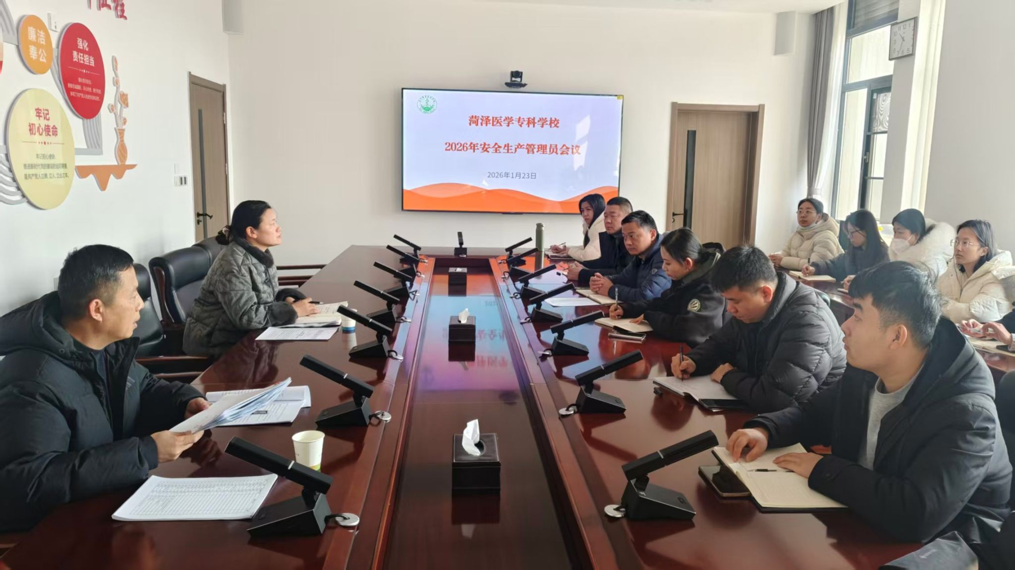 为深入贯彻山东省卫健委关于校园安全工作的决策部署,全面总结当前校园安全形势,压实各环节安全管理责任,切实防范化解各类校园安全风险隐患,2026年1月23日,我校在行政楼会议室召开安全管理工作会议,党委委员副校长代爱英、安全管理处及各系部门的安全生产管理人员参加