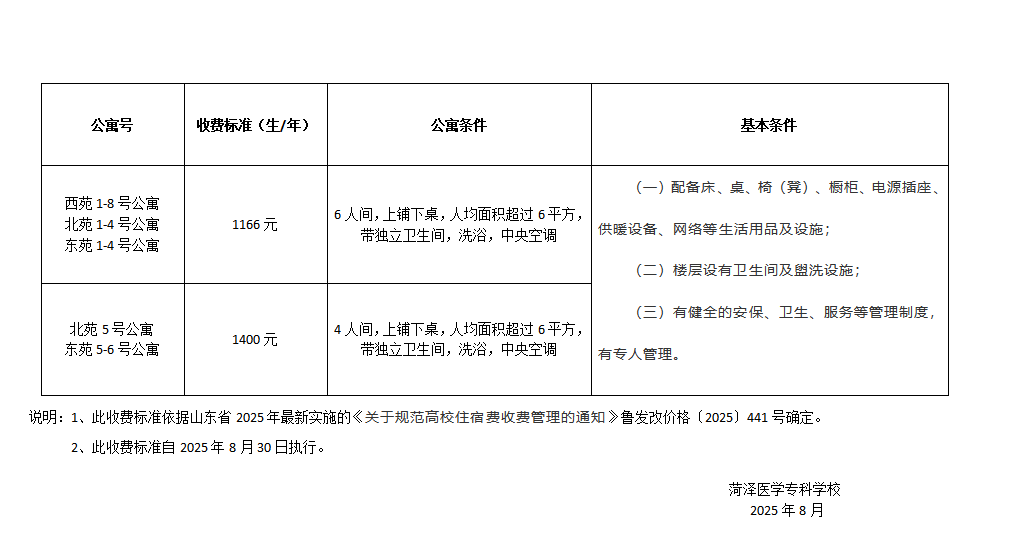 菏泽医学专科学校2025年学生公寓收费标准公示
