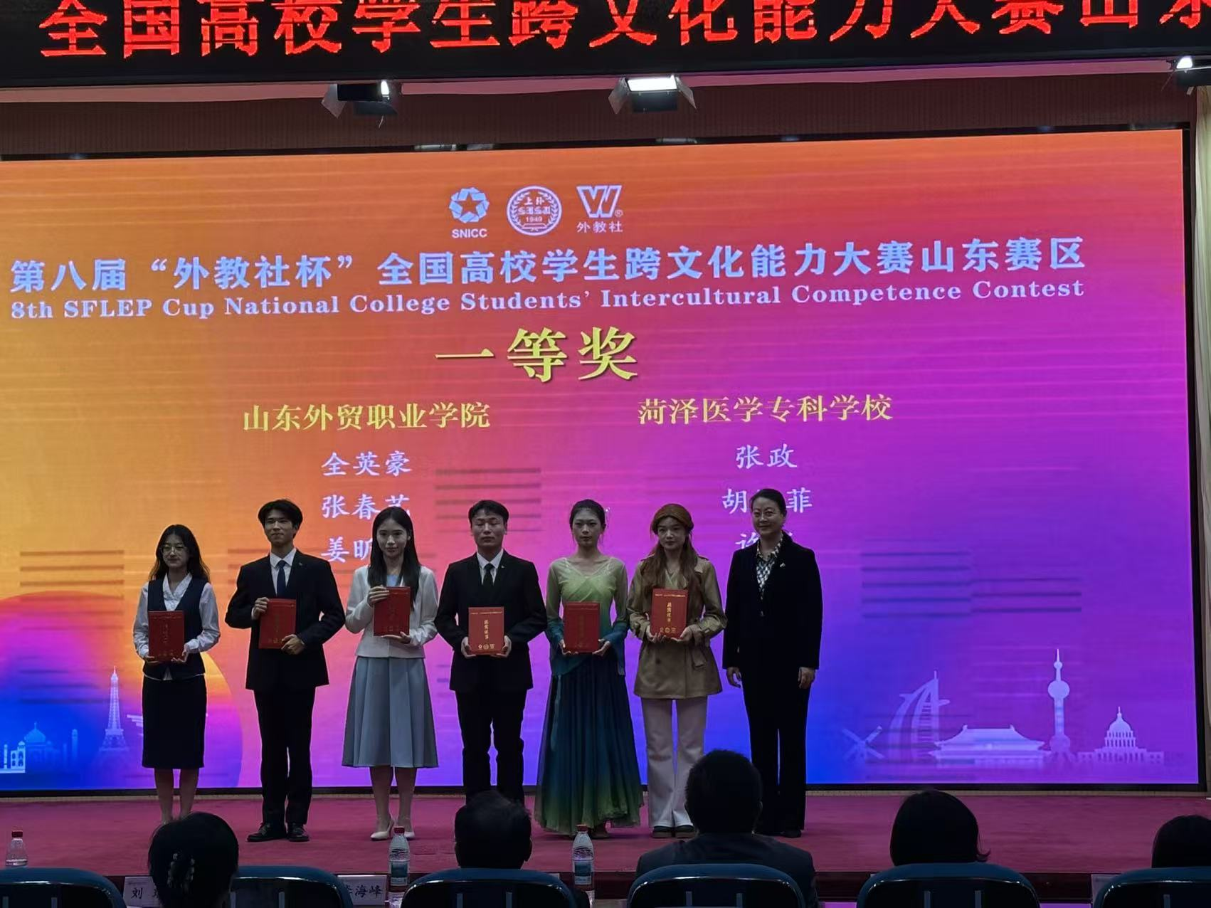 11月1日,第八届“外教社杯”全国高校学生跨文化能力大赛山东省省赛在山东外贸职业学院圆满落幕。由我校2025级临床公费学生张政、口腔专业学生胡钰菲和中医公费学生许悦组成的代表队,凭借扎实的跨文化理论基础、创新的案例分析视角与出色的现场表达能力,在众多参赛高校中脱颖而出,以第二名佳绩斩获一等奖。李文双老师和刘涵老师荣获优秀指导教师奖。