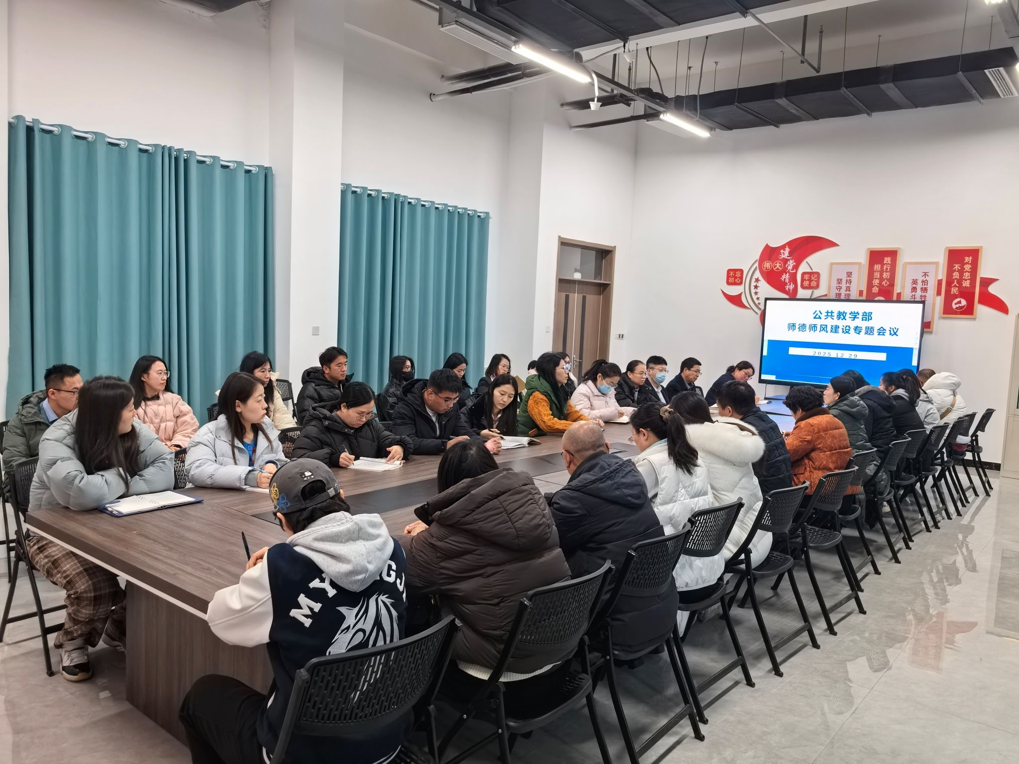 为深入贯彻落实学校关于师德师风建设的最新要求,进一步强化教师思想政治素质和职业道德水平,12月29日下午,公共教学部在系部会议室召开师德师风建设专题会议。会议由公共教学部副主任任俊莲主持,党总支书记李岩、副书记孙蕊及全体教职工出席会议。