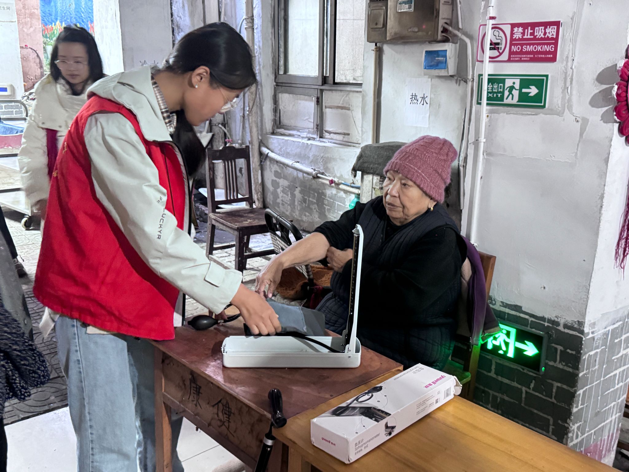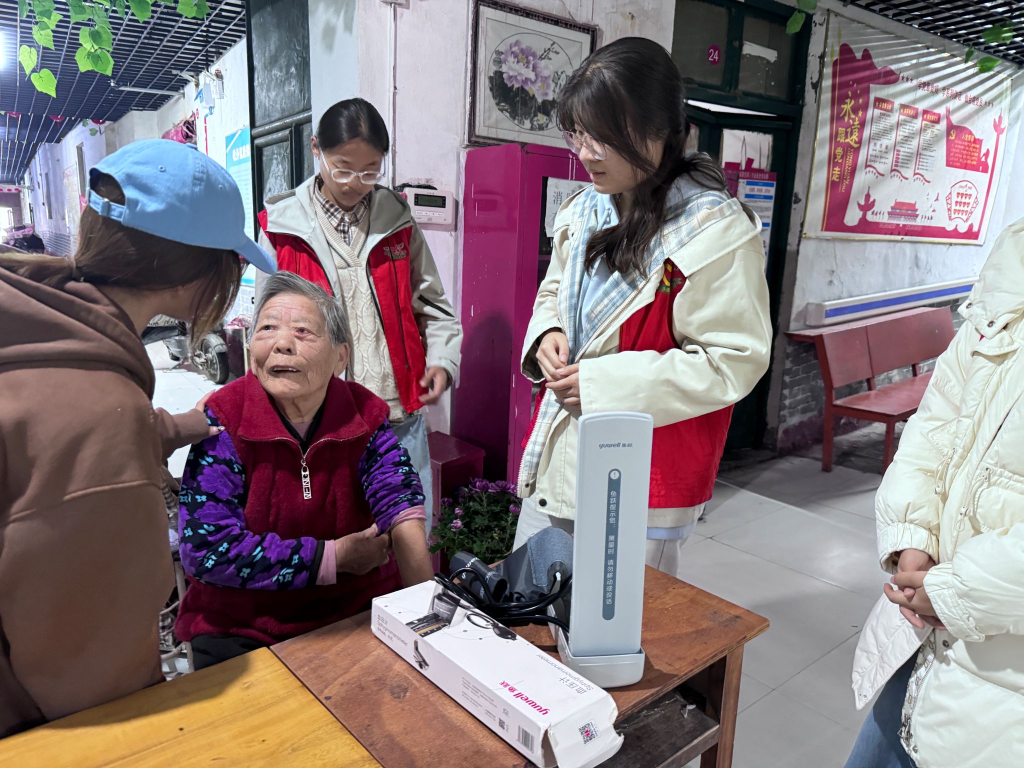 活动筹备阶段,负责人将志愿者划分为健康组、活动组和物资组三个小组,大家各司其职、高效协作。健康组的志愿者认真为老人们测量血压,并耐心讲解日常健康知识,大一同学积极协助完成测量工作;活动组精心组织了趣味套圈游戏,抽纸、实用按摩锤、水杯等丰富奖品吸引了老人们踊跃参与,现场气氛热烈欢快;物资组则负责各类物品的搬运与清点,保障活动有序开展。各组完成本职任务后,志愿者们主动陪伴在老人身边,亲切交谈,倾听他们的故事,送去温暖与关怀。