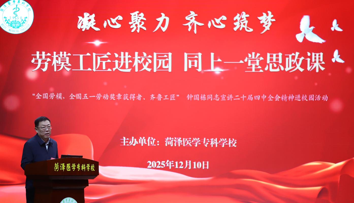 为深入学习贯彻党的二十大和二十届四中全会精神,充分发挥劳模工匠的示范引领和榜样带动作用,12月10日下午,我校特邀全国劳动模范、全国五一劳动奖章获得者、齐鲁工匠、菏泽市博爱医院院长钟国栋开展“劳模工匠进校园 同上一堂思政课”主题宣讲活动,校党委书记袁志勇等学校领导及各二级部门党政负责人、全校师生代表共700余人参加活动。