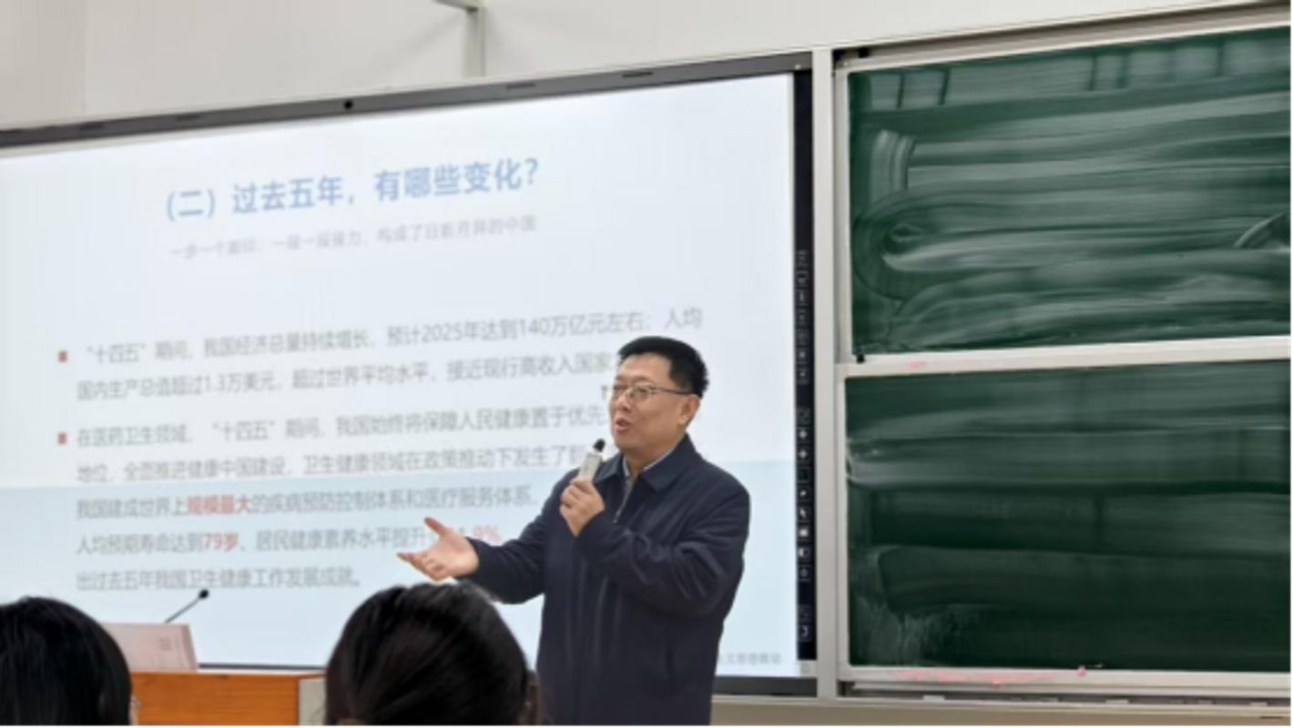 随后,袁志勇结合医学领域发展,阐述“过去五年有哪些变化”。他用数据展现“十四五”时期的显著成就:我国已建成世界上规模最大的医疗服务体系,2024年居民人均预期寿命达79岁,基层医疗资源覆盖持续优化,超过90%的居民15分钟内可抵达医疗点;医学科技实力大幅跃升,国产高端医疗装备实现自主化突破,医保跨省直接结算等惠民政策落地见效,这些变化让师生直观感受国家发展带来的民生福祉提升。
