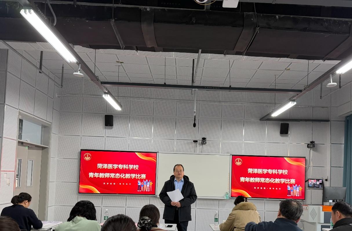 1月21日至22日,菏泽医学专科学校青年教师常态化教学比赛在1号实训楼北楼504举办。学校党委委员、副校长郭树榜出席活动,教务处处长韦岩、各系部主任及青教赛、教学能力大赛省赛荣誉获得者组成评审团,随机抽取的39名入职五年内的青年教师同台竞技。