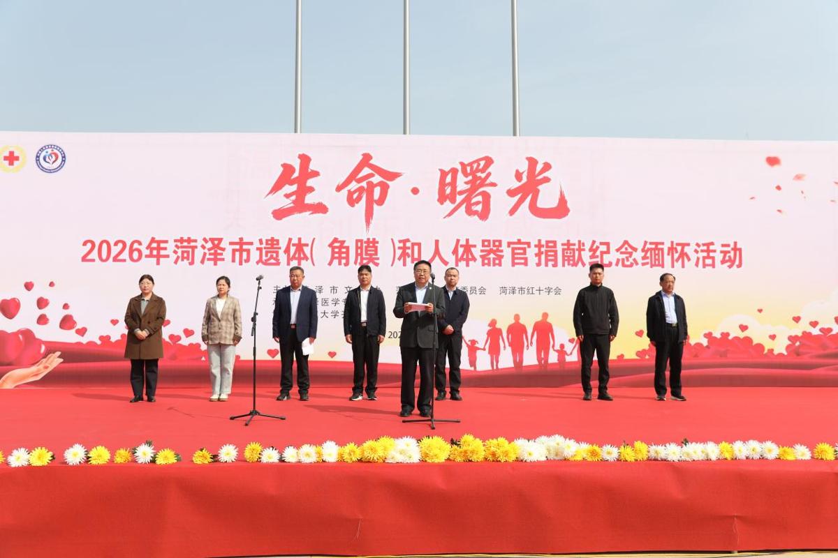 为深切缅怀和纪念遗体(角膜)和人体器官捐献者们高尚的情操,推进我市遗体(角膜)和人体器官捐献工作扎实开展。3月27日上午,“生命曙光”--2026年菏泽市遗体(角膜)和人体器官捐献缅怀纪念活动在我校举办。此次活动由我校医学技术系承办,菏泽市政协副主席赵胜利,菏泽市红十字会党组书记、常务副会长路强,我校党委委员、副校长齐云飞,医学技术系党总支书记牛家峰,基础医学部党总支副书记田凤娟,各县区红十字会负责同志,捐献者家属代表与学生代表共同参与此次活动。