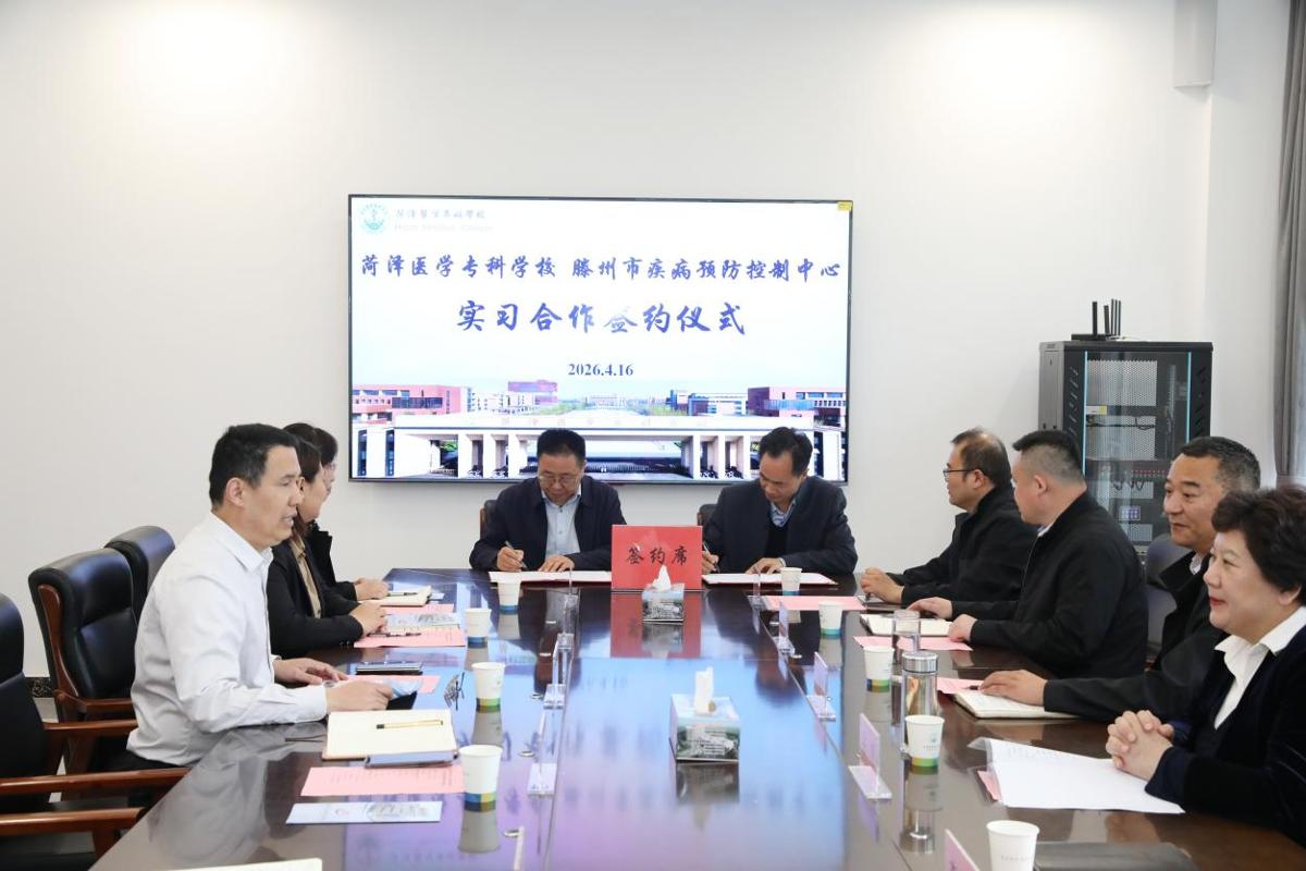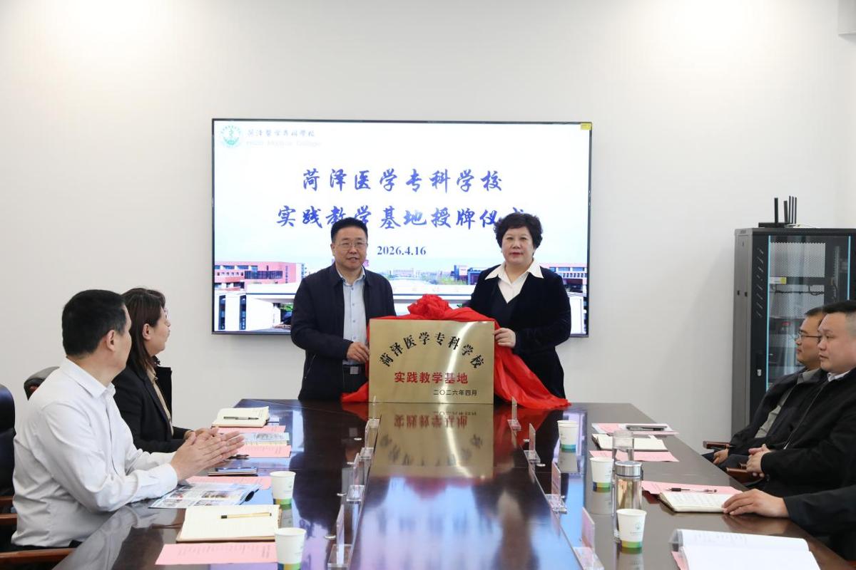 在与会人员的共同见证下,齐云飞与滕州市疾病预防控制中心党委副书记、主任李晓明代表双方签署了实习合作协议。随后,齐云飞与神艳共同为“实践教学基地”揭牌。