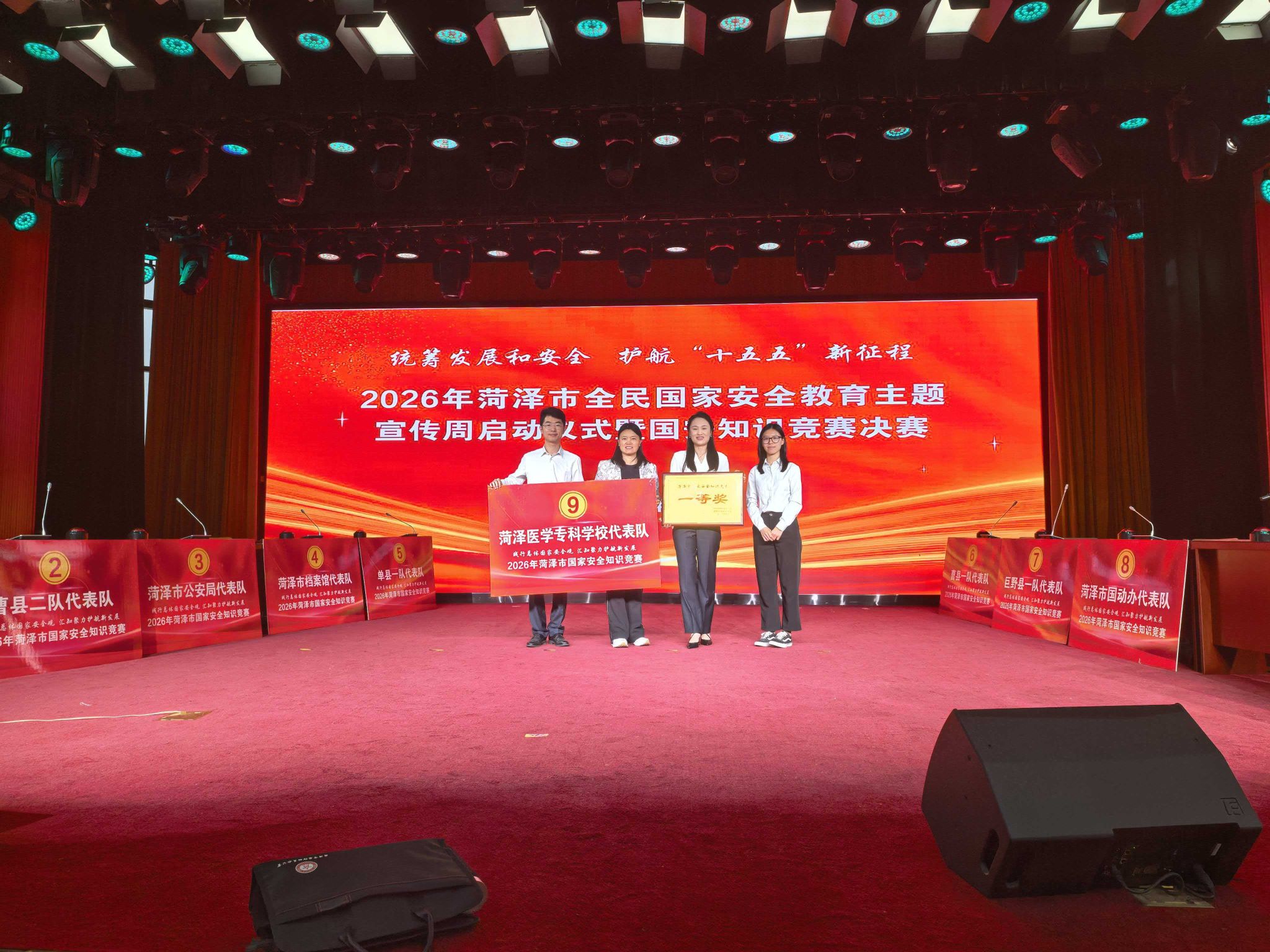 4月15日,由中共菏泽市委办公室、菏泽市国家安全局主办的2026年菏泽市全民国家安全教育主题宣传周启动仪式暨国家安全知识竞赛决赛在菏泽职业学院圆满收官。经过激烈角逐,菏泽医学专科学校代表队凭借过硬实力与出色发挥,以总分第一名的佳绩勇夺大赛一等奖。
