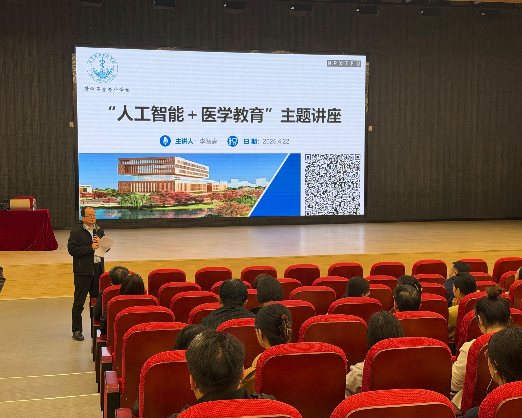 讲座伊始,郭树榜对李智高教授的到来表示热烈欢迎和诚挚感谢。他指出,人工智能正深刻重塑教育形态,医学教育已进入数字化、智能化转型关键期。本次培训紧扣“十五五”教育发展战略,聚焦AI赋能医学专业建设与人才培养,对提升教师数字教学能力、优化教学模式、构建高质量医学教育体系具有重要指导意义,希望全体教师认真学习、深入思考,推动前沿技术与教学实践深度融合。