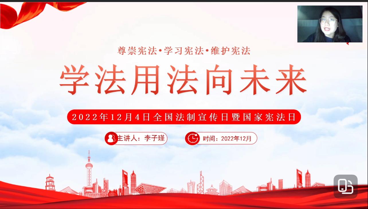 2022年是我国现行宪法颁布施行40周年,12月4日,我国将迎来第九个国家宪法日。为深入学习贯彻党的二十大精神,弘扬宪法精神,进一步提升护理系学生干部的法律素养,发挥好学生骨干学法、守法、用法的引领示范作用,护理系2022年“青马工程”培训班于12月2日晚通过线上方式举办了“学法用法向未来”专题讲座。本次讲座由护理系专职辅导员李子瑾主讲,护理系学生会成员、学生社团负责人、入党积极分子及各班班长、团支书参加了学习。
