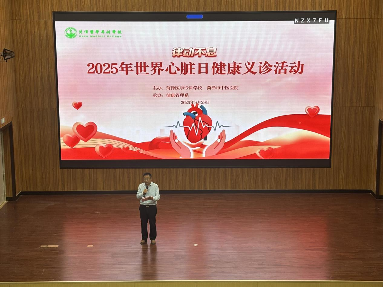 9月29日是世界心脏日,为进一步普及心血管疾病防治知识,推进健康中国建设,我校健康管理系和菏泽市中医医院联合举办2025年世界心脏日健康义诊活动。学校党委委员、副校长齐云飞,菏泽市中医医院副院长邓海霞、心内科副主任医师曹培镇、吕明,校学生工作处处长孙战,团委书记于淼,健康管理系党总支书记李莹以及健康管理系师生共400余人参与活动。