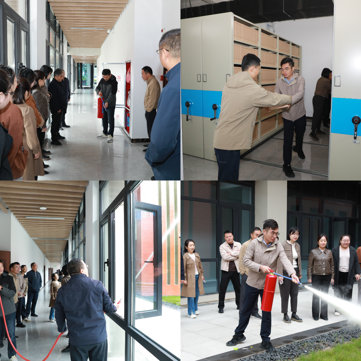 本次演练分为档案库房突发进水事故的应急抢救和消防器材规范使用与初期火情处置两种场景演练。在档案室陈航老师与安全管理处王志栋老师的讲解下,整个演练过程响应迅速、部门协同操作规范高效,档案人员对档案应急处置、消防器材应用与初期火情应对的能力得到进一步提升。