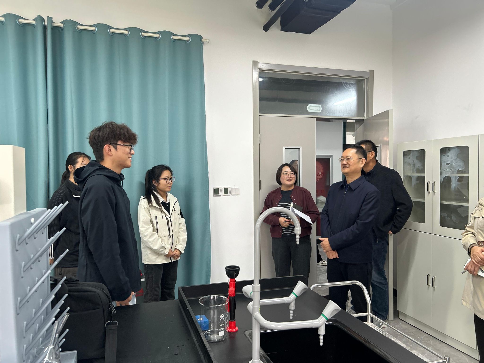 随后,高军一行来到实验室进行检查,认真查看实验室的环境布局、安全设施配备,询问实验课程的开设情况以及学生实验操作的规范性等问题。高军与正在进行实验备赛的学生们进行亲切交流。学生们热情介绍自己正在进行的实验内容,高军耐心倾听并鼓励学生们要珍惜实验学习的机会,在实践中扎实掌握专业知识和技能,培养严谨的科学态度和创新精神。同时,高军叮嘱陪同的教师,要高度重视实验室安全工作,加强对学生的安全教育和实验操作指导,确保实验室教学工作安全、有序开展。