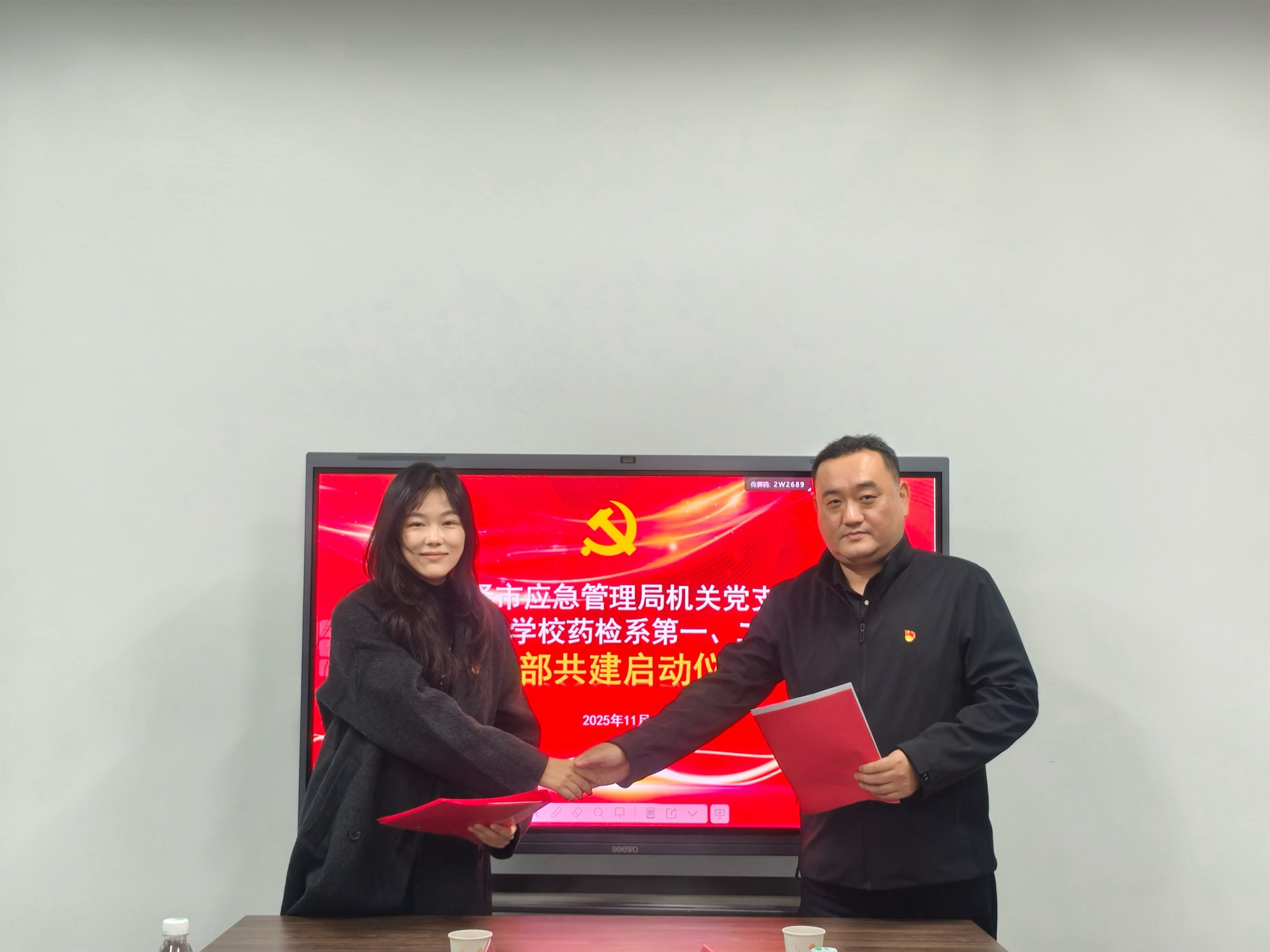 为深入学习贯彻党的二十大精神,进一步发挥党建引领作用,深化党建与业务融合,探索“医药+应急”跨领域协作新模式,11月13日上午,我校药学与检验系第一党支部、药学与检验系第二党支部与菏泽市应急管理局机关党支部开展党建结对共建活动。菏泽市应急管理局应急管理保障和技术服务中心主任赵飞,市应急管理局三级调研员、机关党委专职副书记孟伟,学校党委副书记蒋继国,药学与检验系党总支书记田文革及双方党员代表参加了本次活动。