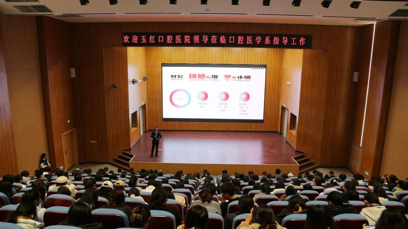 为引导学生明晰职业方向,提升就业竞争力,11月21日下午,我校口腔医学系在师生活动中心举办“口腔大家谈第三讲”职业规划与就业指导宣讲会。特邀玉红口腔医院创始人、院长贾玉红主讲,校企合作与培训就业处处长王学贺、副处长王宗军,口腔医学系党总支副书记牟翠荣、副主任张景华及系部师生300余人参与活动。