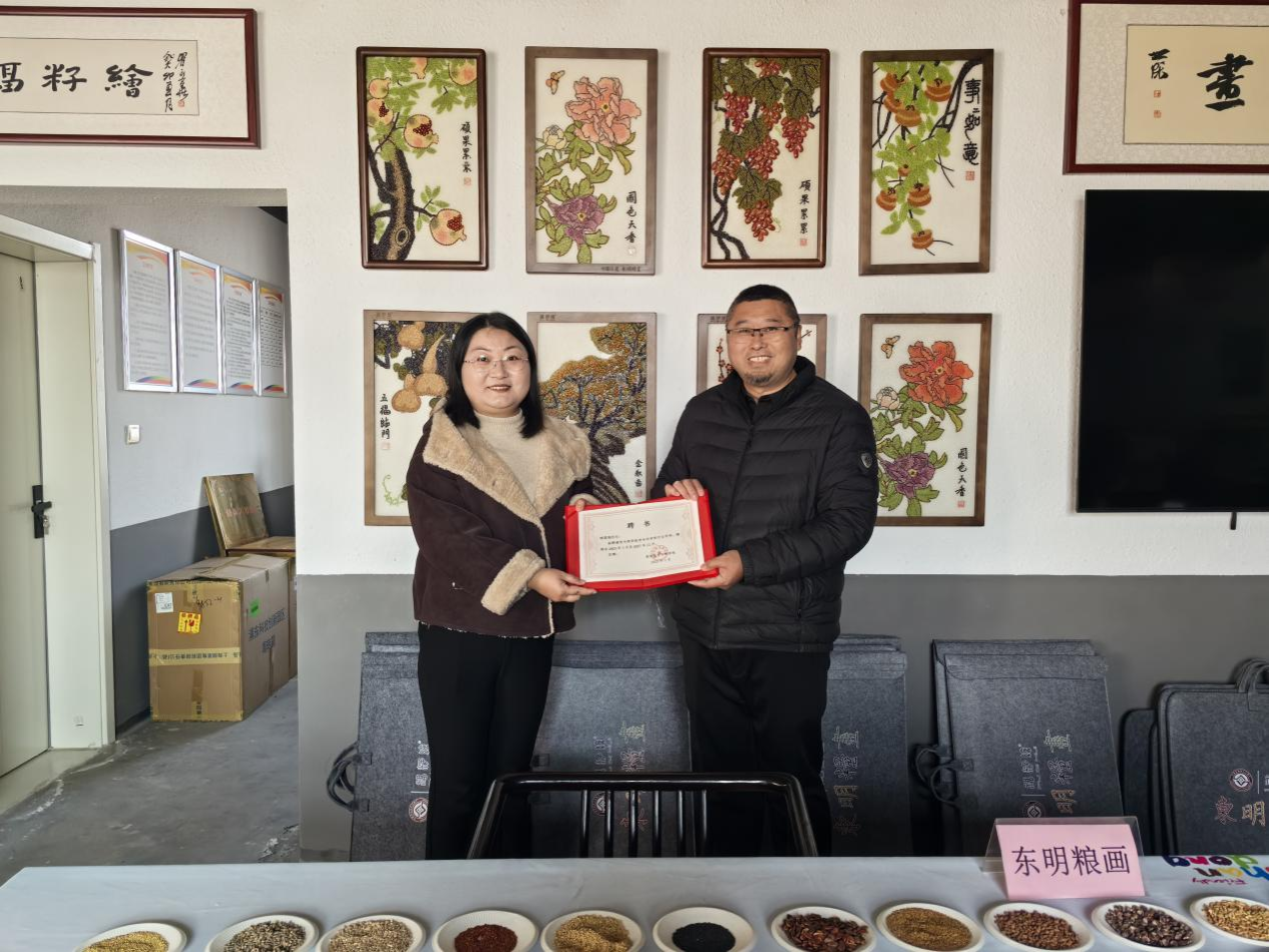 在东明粮画文化产业有限公司,调研团队深入了解粮画创作的全过程。韩国瑞向大家展示如何将平凡的五谷杂粮转化为精美艺术品的高超技艺,作为省级非物质文化遗产代表性传承人,韩国瑞介绍了他对传统粮画的创新与发展,不仅解决了粮画防虫、防霉的技术难题,还使作品颜色和造型更加丰富多样,展现了非遗文化的时代活力。
