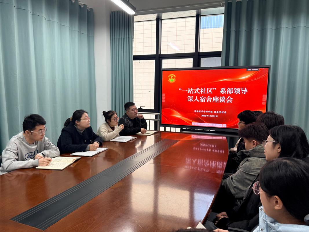 为扎实推进学生“一站式社区”建设,落实系部领导深入基层联系学生工作机制,及时解决学生思想、学习、生活等方面的实际问题,12月31日,健康管理系组织召开“一站式社区”系部领导深入宿舍座谈会。健康管理系党总支书记李莹、党总支副书记陈鲁曼、辅导员代表及15名学生代表参加座谈。
