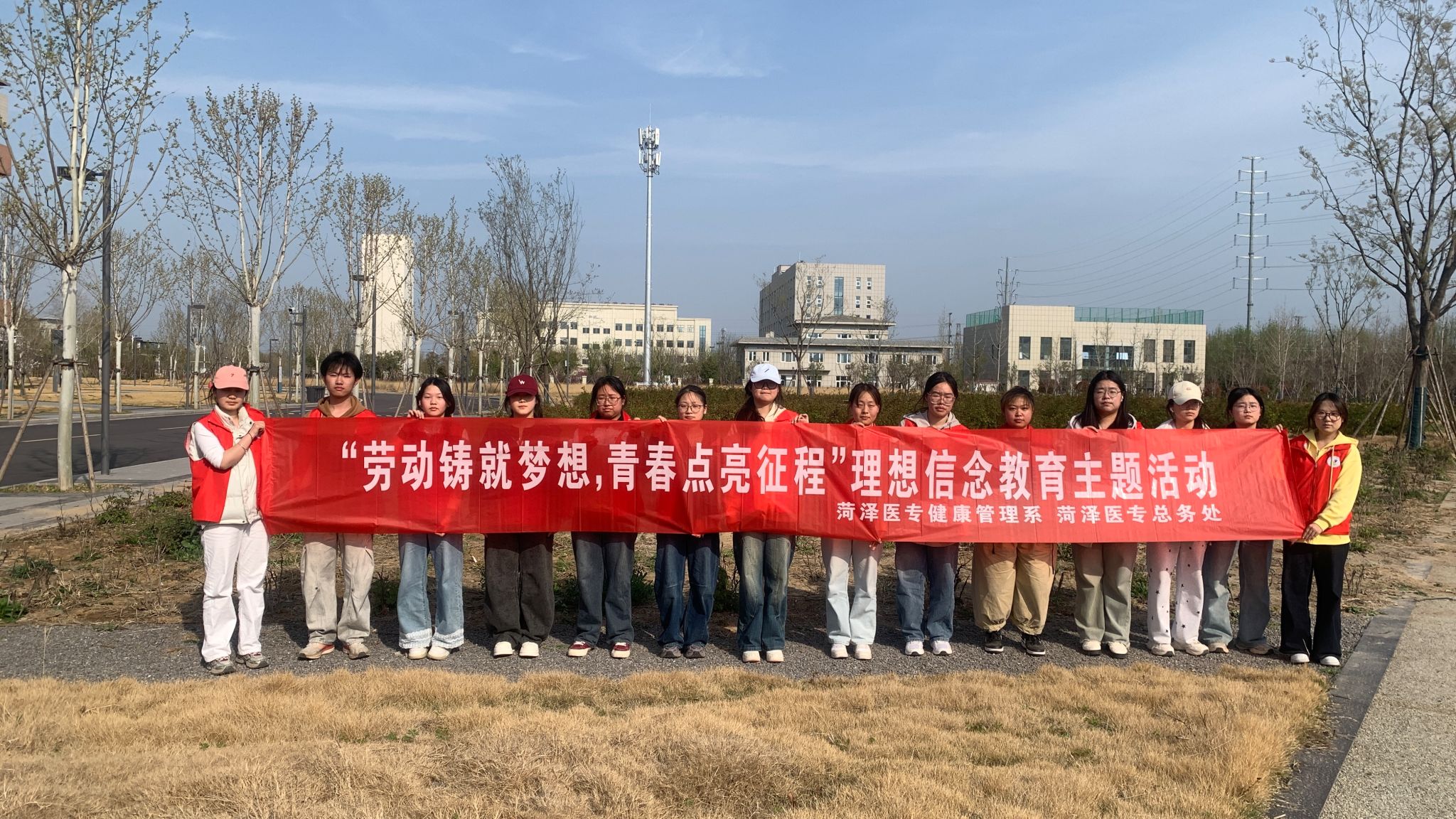为深化“一站式”学生社区育人实效,引导学生树立正确的劳动观念,在实践中坚定理想信念。3月29日菏泽医学专科学校健康管理系联合总务处,在校园内开展“劳动铸就梦想,青春点亮征程”理想信念教育主题实践活动。健康管理系“青马工程”培训班学员20余人参加活动。