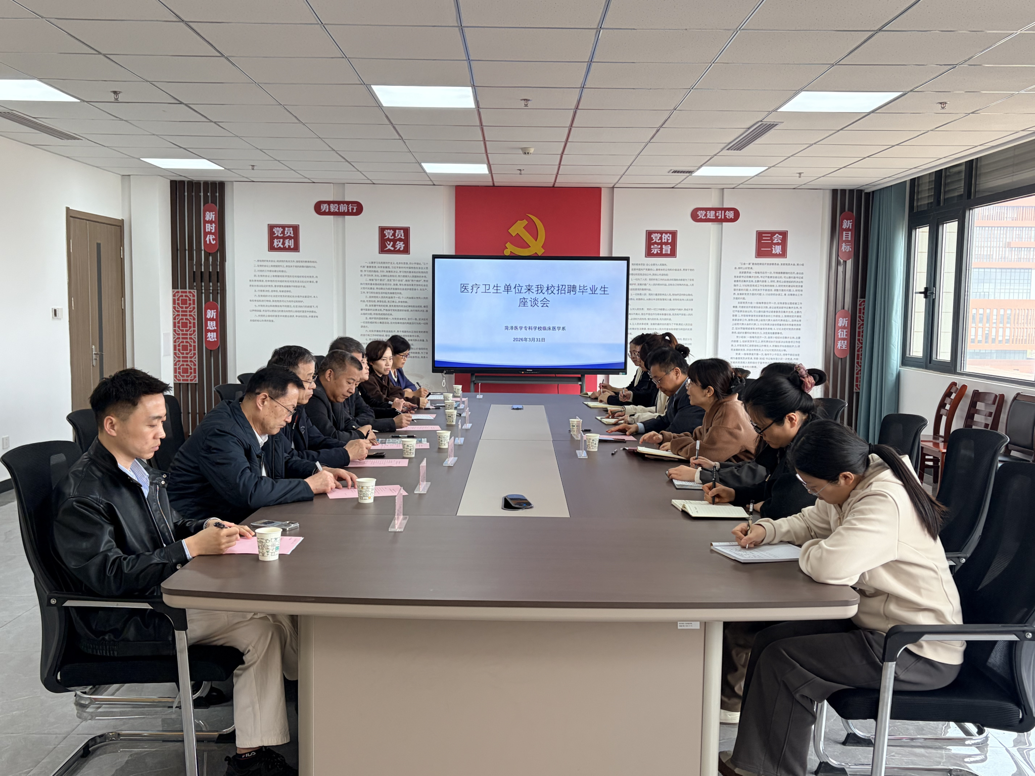 为扎实推进2026届毕业生就业工作,3月31日,临床医学系在3号实训楼B座516党员会议室举办访企拓岗暨校院交流座谈会。吉木乃县人民医院、曲阜市精神卫生中心等11家医疗机构负责人受邀出席。校党委委员、副校长齐云飞,临床医学系专职辅导员及学业导师等参加座谈,会议由系党总支书记吴琪主持。