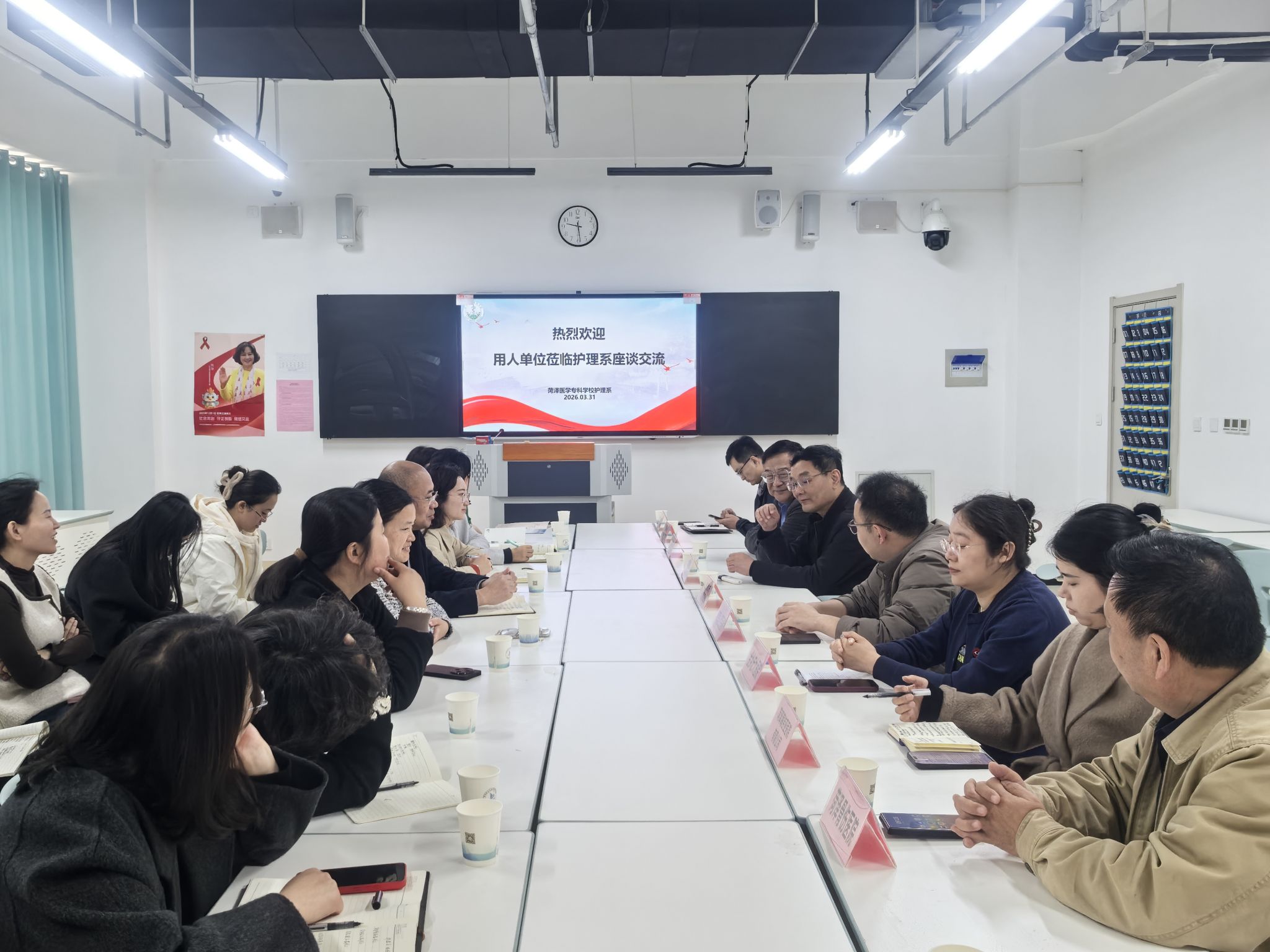 为深入贯彻落实党中央、国务院关于做好高校毕业生就业工作的决策部署,进一步拓宽护理专业毕业生就业渠道,深化产教融合、校企协同育人,3月31日,我校护理系举办访企拓岗促就业座谈会。菏泽市荣军优抚医院、曹县人民医院、成武县人民医院、曲阜市人民医院、菏泽骨伤医院、菏泽海吉亚医院有限公司、曹县磐石医院、金乡宏大医院、山东香柏养老集团有限公司、济南莱芜宏博养老服务有限公司等10家医疗机构及养老服务企业代表齐聚一堂,与学校共同探讨人才培养与就业合作新路径、新举措。校党委委员、副校长代爱英,护理系党总支书记刘明哲、主任马国平、副书记杨珂,各教研室主任及全体专职辅导员参加本次座谈会。