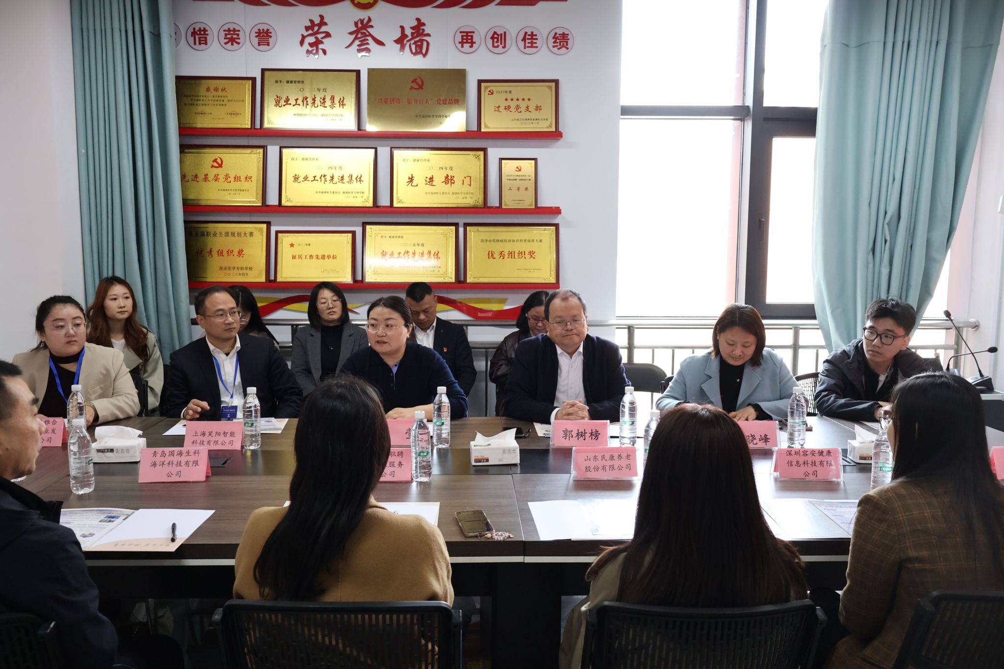 为拓宽校企合作交流渠道,进一步推动毕业生高质量就业,3月31日上午,我校健康管理系举办“访企拓岗促就业”座谈会,邀请惠誉养康(上海)企业发展有限公司、山东民康养老股份有限公司、上海青藤职聘人力资源服务有限公司、山东香柏养老集团等十一家企业代表与会洽谈合作事宜。校党委委员、副校长郭树榜,健康管理系党总支书记李莹、主任石晓峰、教师代表参加座谈会。