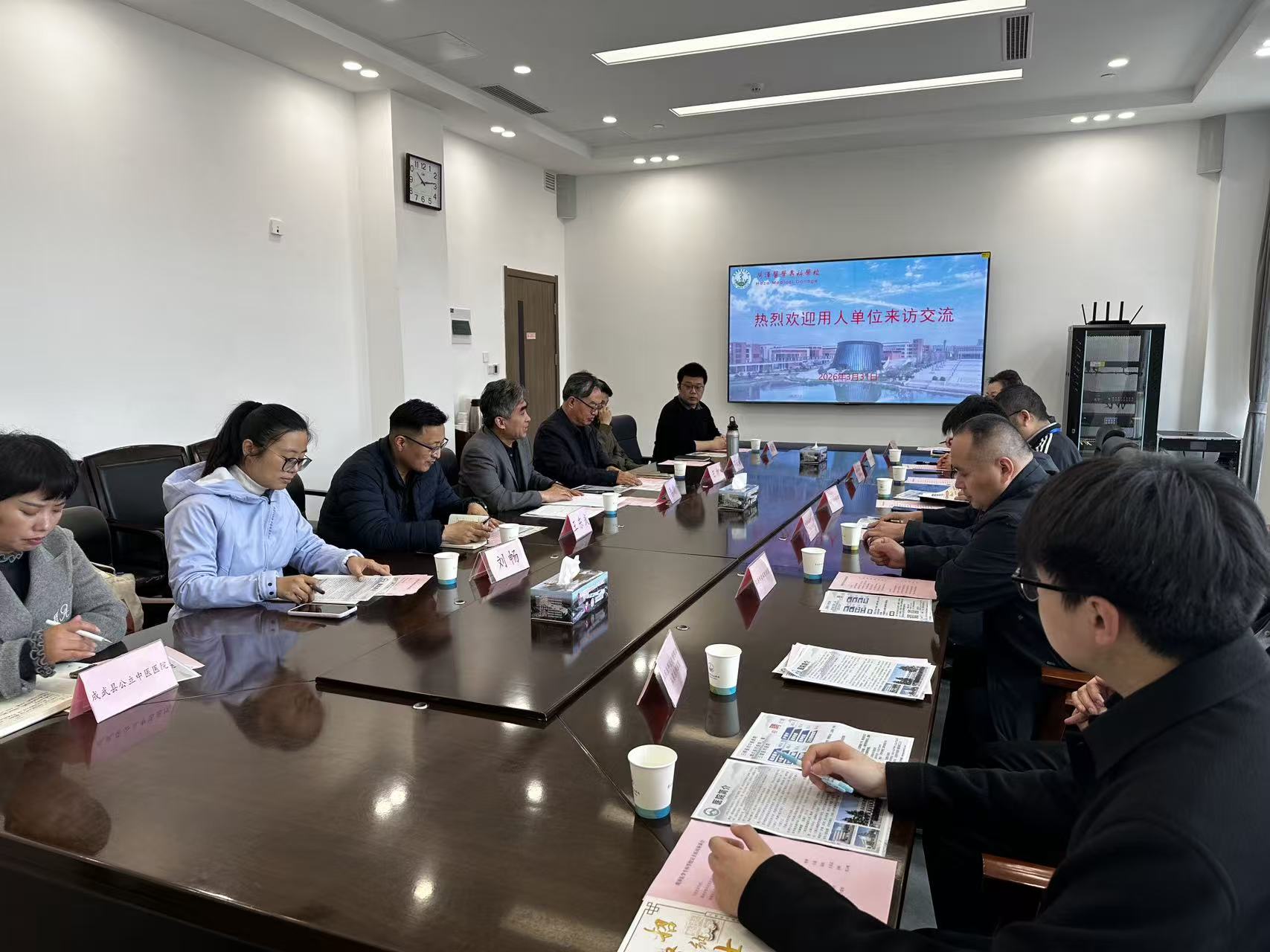 为精准对接用人需求、拓宽毕业生就业渠道,3月31日上午,中医药系在办公楼402会议室召开2026年春季访企拓岗校企座谈会。校党委委员、副校长李铮,中医药系主任王旭及专业教师代表,与菏泽市荣军优抚医院、聊城市东昌府区广平中心卫生院、山东医邦医疗有限公司五莲医邦医院、菏泽市妇幼保健院、成武县公立中医医院、山东一方制药有限公司、桓台起凤整骨医院、北京基谱生物科技有限公司、鄄城马爱云医院、郓城唐塔医院、菏泽曹州医院等共11家企业代表参会交流。