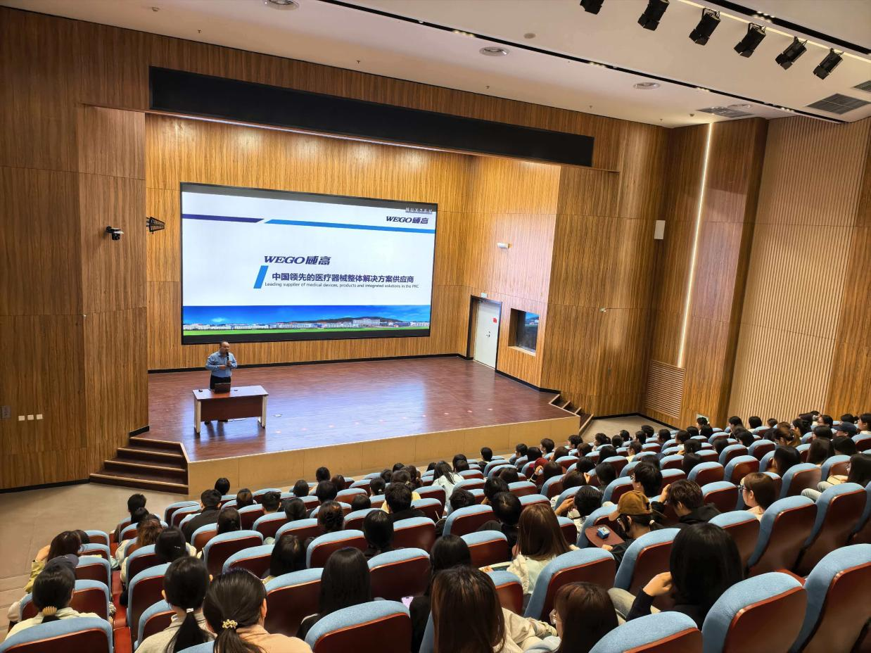 威高集团人力资源经理翟泽豪从当前医药行业就业趋势切入,系统分析了专业人才的市场需求与发展前景。随后,通过生动的图文展示,介绍了威海的城市特色——从宜居的生态环境、丰富的海洋资源,到地道的海鲜美食、热门旅游景点,全方位激发了同学们对威海的向往与期待。在企业介绍环节,宣讲人详细讲解了威高集团的企业文化、实习晋升路径、岗位设置及薪酬标准,并重点说明了员工福利保障体系,让同学们对企业发展与个人成长路径有了全面认知。宣讲结束后,现场进入答疑交流与面试环节,企业负责人耐心解答岗位适配、实习安排等问题,与意向学生一对一沟通,选拔优秀人才。