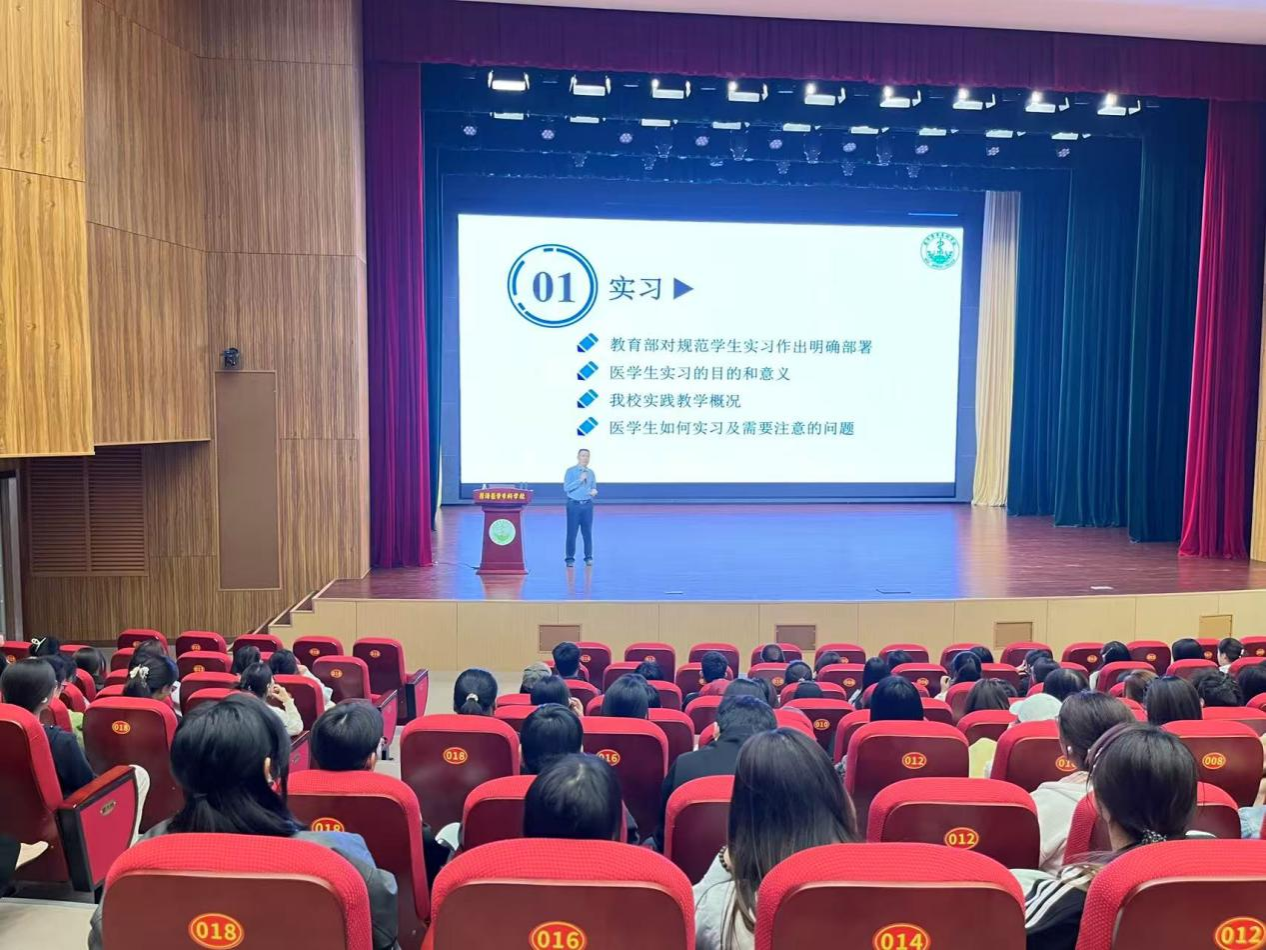 王学贺首先阐述了医学实习的核心意义与重要目的。他表示,实习是衔接课堂理论与临床实践的重要纽带,是提升专业技能、积累行业经验、锤炼职业素养的关键阶段,更是医学生迈向职场的重要基石。其次,结合医学行业工作规范与典型案例,讲述学生实习期间纪律要求与行为准则:学生需严守岗位职责,不可擅自向患者及家属作出医疗相关承诺;严格遵守带教老师工作安排,恪守工作边界,不越权、不越级开展超出自身能力范围的工作等。同时着重强调医疗隐私保护红线,坚守医疗职业道德与保密原则。最后,引导学生科学制定职业生涯规划,客观认清行业发展形势,树立理性、务实的正确就业观念。鼓励学生结合自身兴趣、专业特长明确发展目标,合理平衡学习、实习与未来发展,不断提升综合竞争力,以严谨的态度、饱满的热情投入今后的学习和实习工作。
