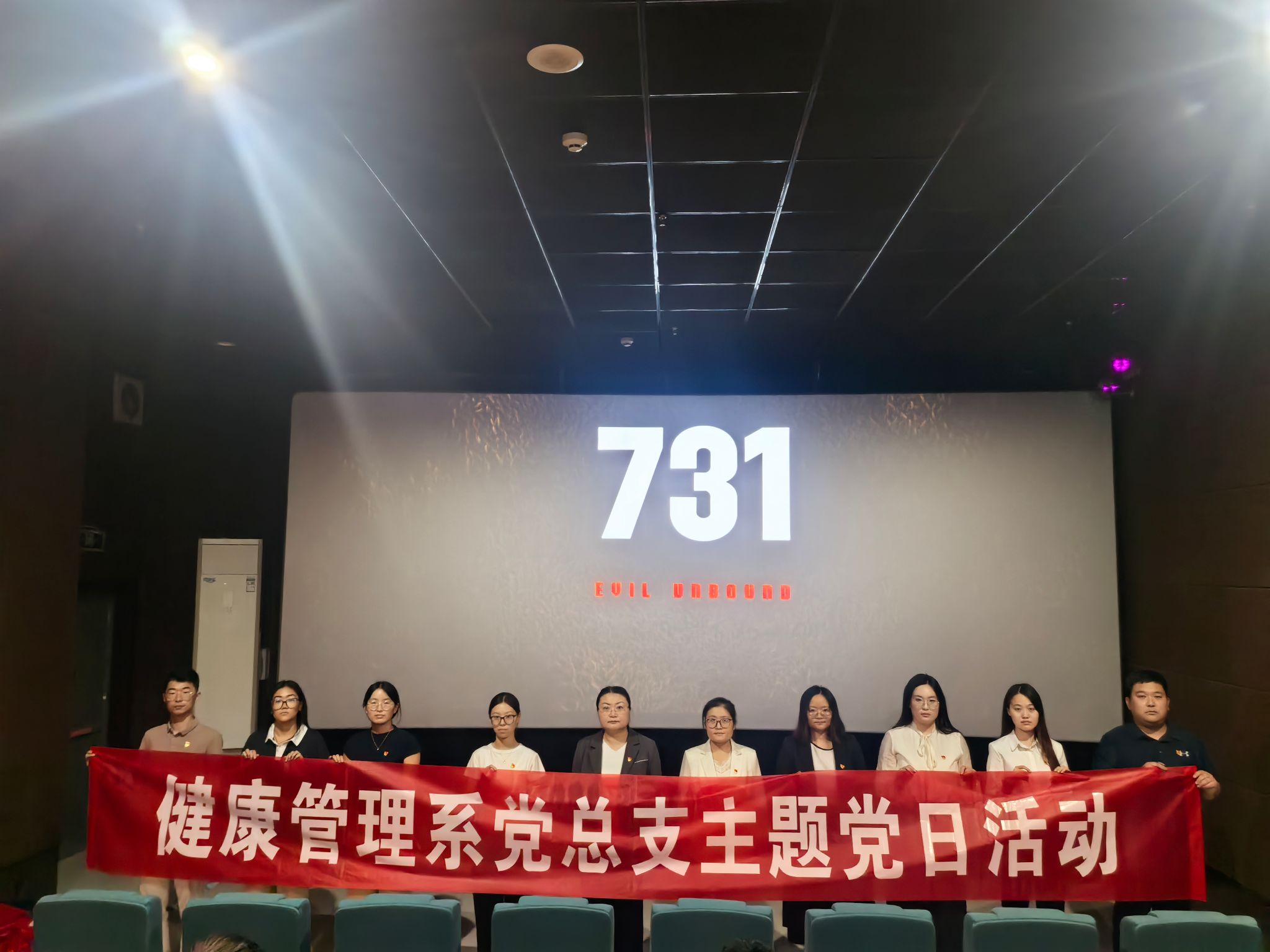 为深入学习贯彻习近平新时代中国特色社会主义思想,弘扬爱国主义精神,引导广大党员铭记历史、砥砺奋进,9月18日健康管理系党总支开展"铭记历史之殇,砥砺强国之志"主题党日活动,集体观看历史题材影片《731》。健康管理系党总支书记李莹、系主任石晓峰、党总支副书记陈鲁曼以及全体党员同志参加。