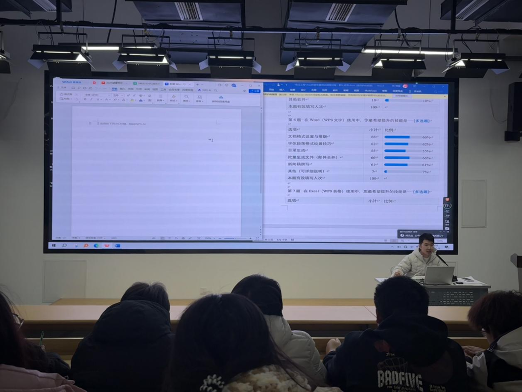 本次培训涵盖办公软件应用、效率提升技巧和AI赋能三部分内容。杨曦晨详细讲解了Word文档格式设置、Excel数据分析、公文与通讯稿写作等实用技能,结合团学干部的日常工作场景进行实际案例演示,帮助学员快速掌握高效办公技能。整个培训过程中,学员们认真学习并作记录,学习氛围浓厚。