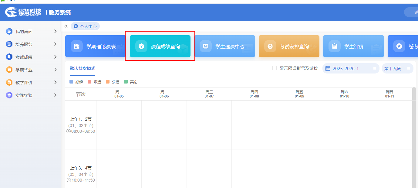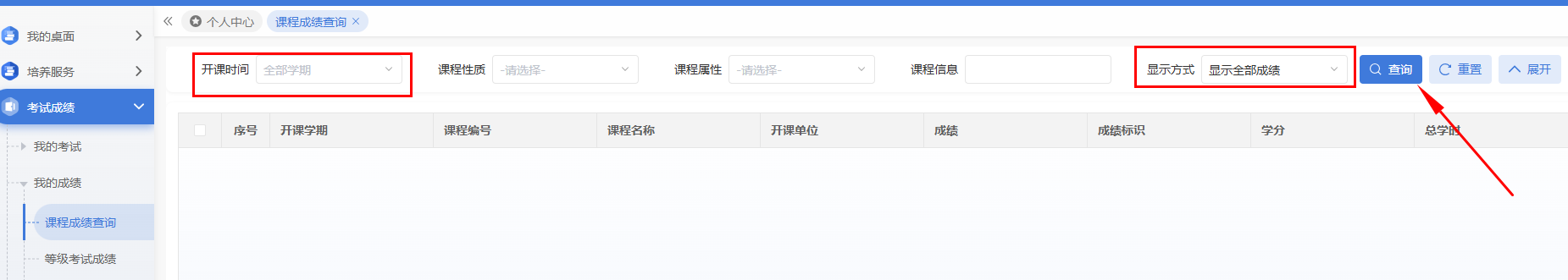 登录个人教务系统,点击“课程成绩查询”,选择相应的开课学期,显示方式选择“显示全部成绩”或“显示最好成绩”可查询到本人成绩。