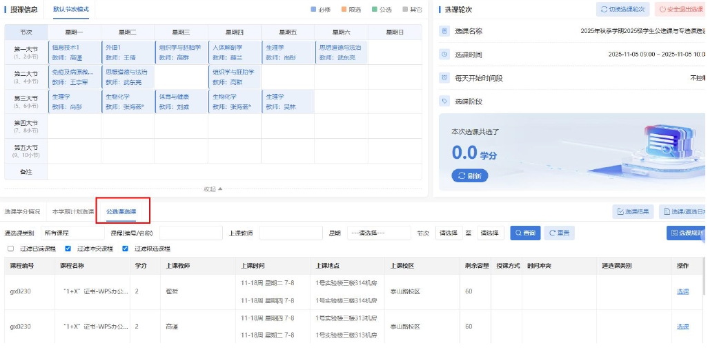 3、点击“公选课选课”或“本学期计划选课”,仔细查阅各课程的“上课时间”,如果和自己的必修课时间冲突,一定不要选课,以免自己无法上课(若冲突,系统也会提示)。若无时间冲突,可以点击右侧“选课”来选择课程。如提示有选课限制,说明不符合选课要求,请按照通知要求选择其他课程或其他班级。