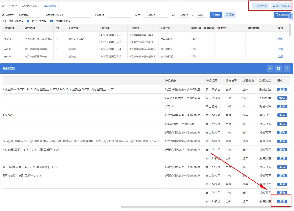 4、选课成功后,可在右侧查看选课结果;若要退选,点击课程右侧“退选”,选课和退课记录均可在“选课/退选日志”查看。
