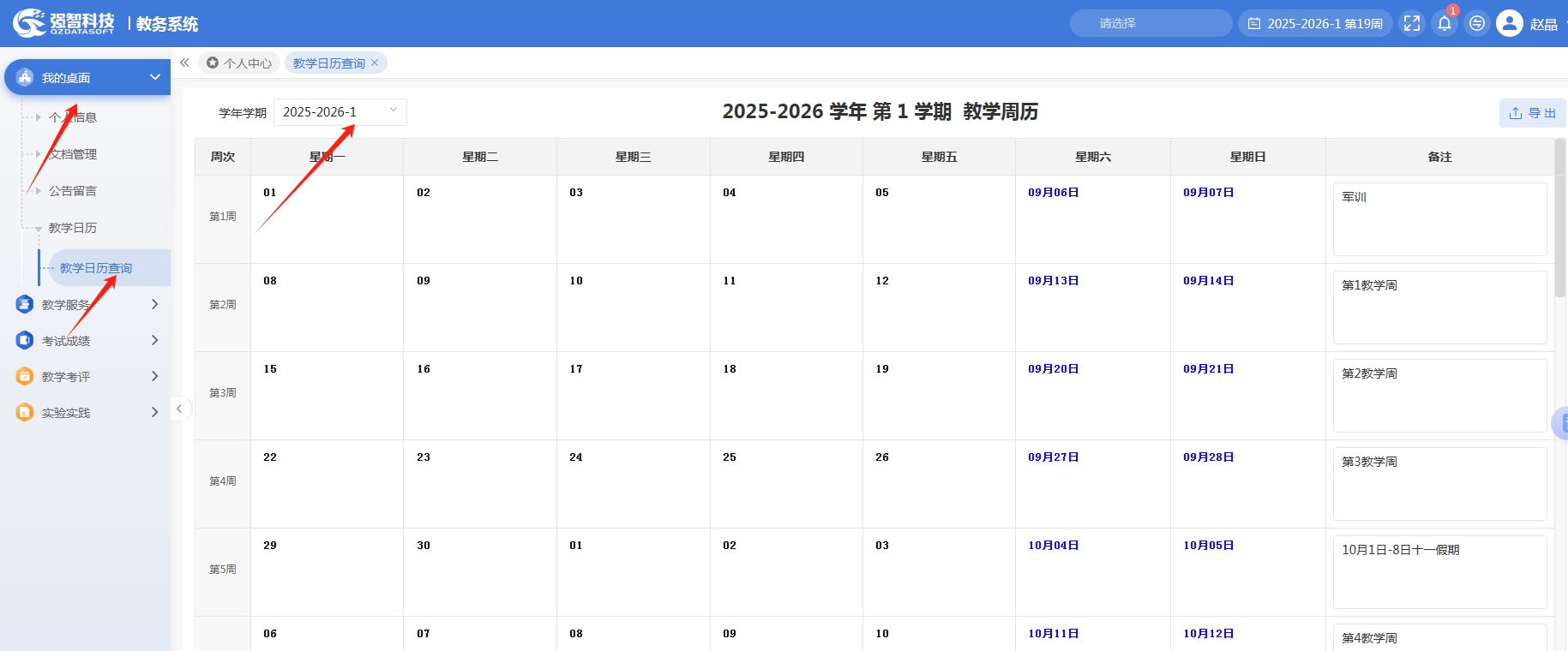 通过电脑端登录教务系统--点击我的桌面--教学日历查询--选择对应的学期