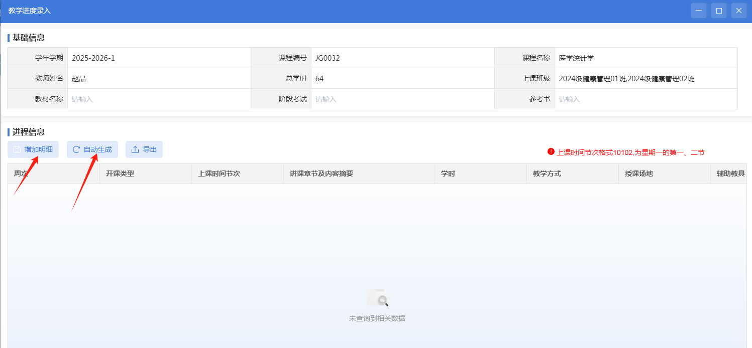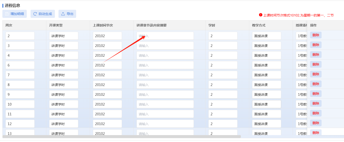 2、点击增加明细或自动生成,点击自动生成后,会根据课表内容生成周次上课进程