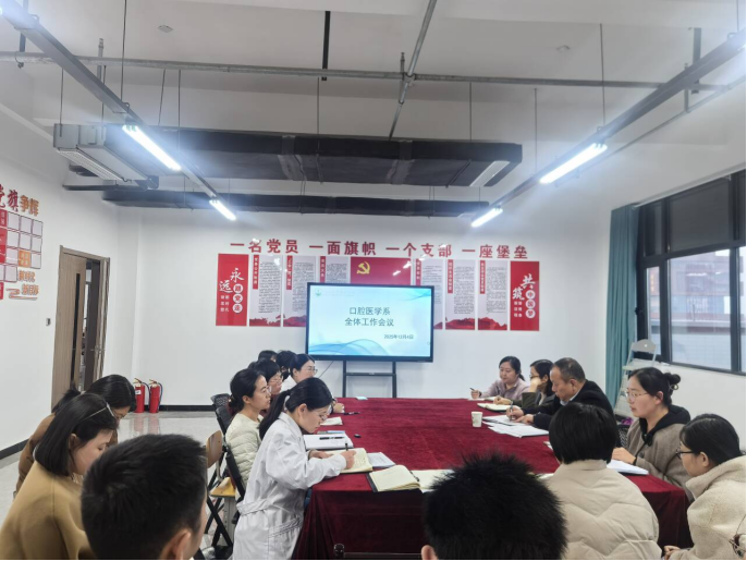 为统一思想共识、夯实育人根基,推动系部事业高质量发展,12月4日,口腔医学系在系部会议室召开全体教师会议。附院党委书记、口腔医学系主任宋恒国,系副书记牟翠荣,系副主任张景华及全体教师参会,会议由牟翠荣主持。