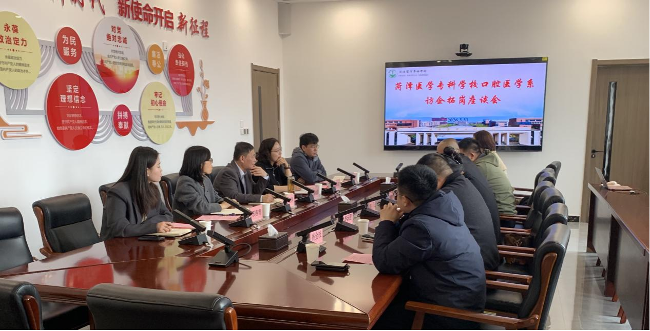 为深入落实访企拓岗促就业专项行动,精准对接口腔医疗行业人才需求,拓宽毕业生就业渠道,3月31日,菏泽医学专科学校口腔医学系在办公楼401会议室召开访企拓岗专项座谈会。学校党委副书记蒋继国、系党总支副书记牟翠荣、吕继忠、系副主任张景华、教师代表以及全省10家优质口腔医疗单位代表参会,会议由牟翠荣主持。