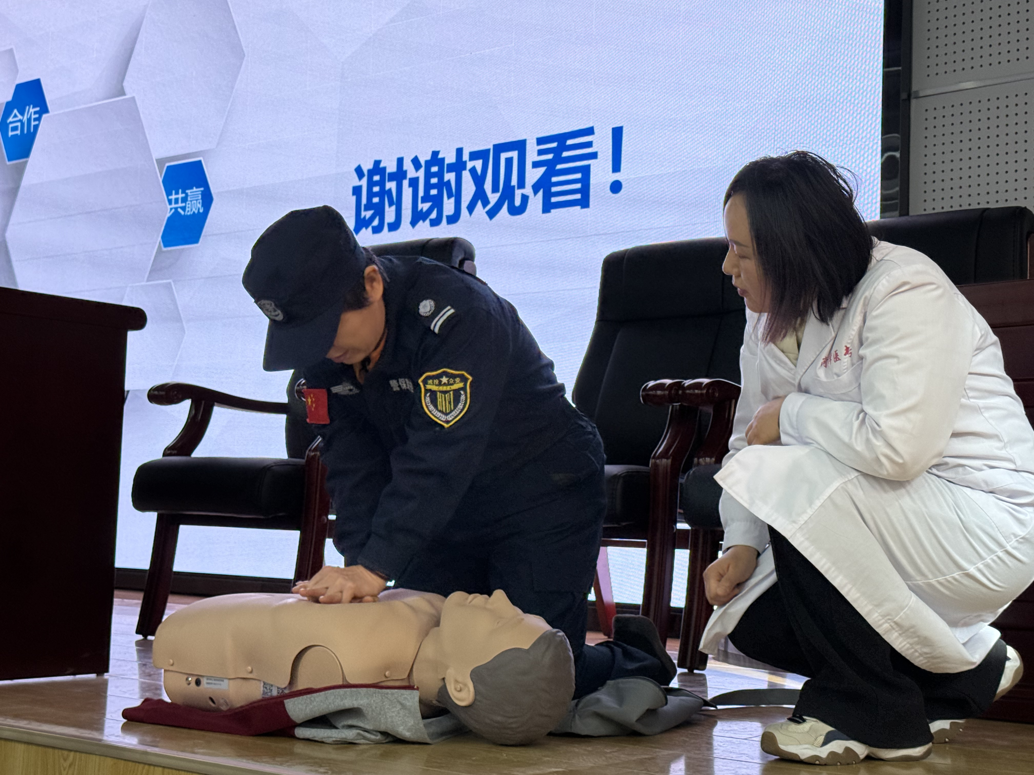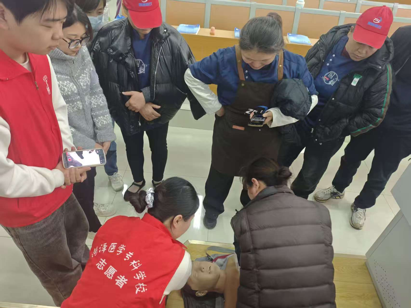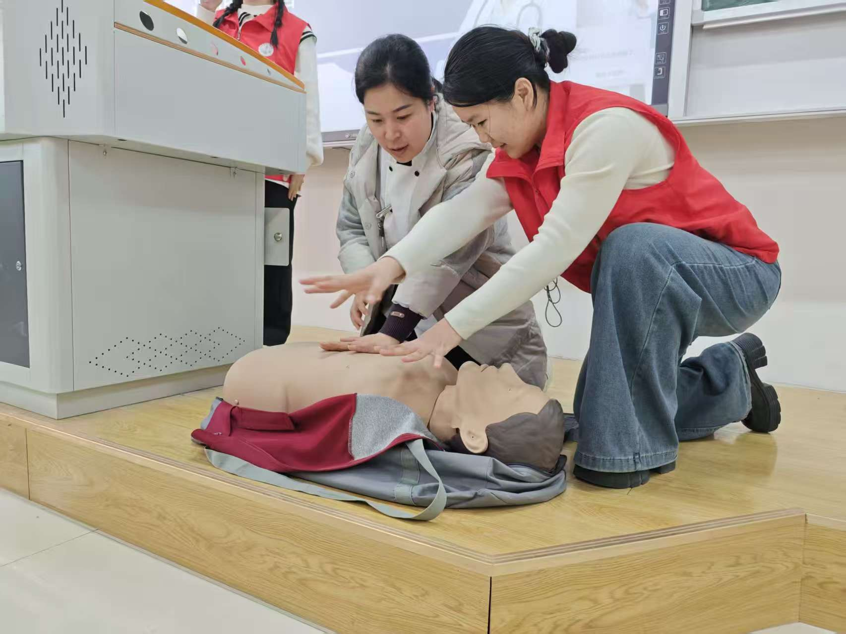 在实操环节中,参训人员分组练习胸外按压、人工呼吸及气道异物梗阻解除手法。师生团队全程指导,通过“手把手”教学、反复演练与实时答疑,帮助大家掌握关键急救技能。现场学习气氛热烈,参训人员踊跃参与,动手能力与应急意识得到切实提升。