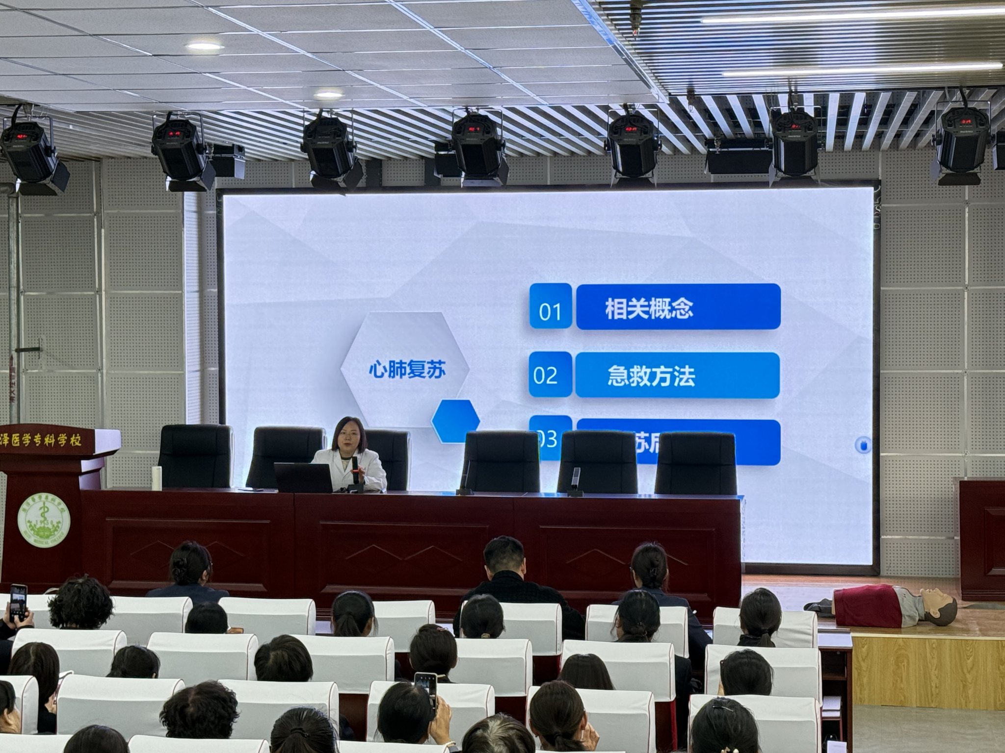 为增强校园应急救护能力,完善安全体系建设,11月27日至12月2日,我校临床医学系第一党支部组织师生团队面向泰山路校区安保、后勤及餐厅工作人员,在办公楼报告厅和2号教学楼102教室组织开展了两期急救技能专题培训。本次培训由临床医学系内科学教研室副主任刘瑞婷老师与“急救天使队”队长李梓菡共同主讲,累计培训400余人,取得良好成效。