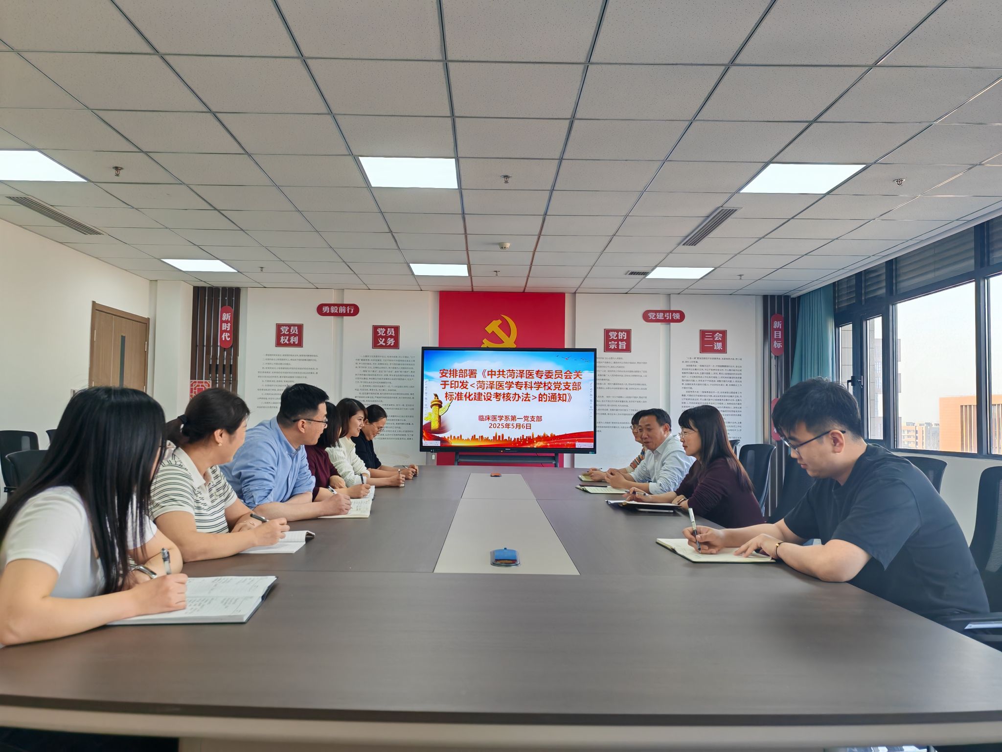 为深入贯彻落实学校党委党建工作要求,全面推进党支部标准化、规范化建设,5月6日,临床医学系第一党支部召开专题会议,集中学习并部署落实《菏泽医学专科学校党支部标准化建设考核办法》相关工作,党总支书记吴琪主持会议。