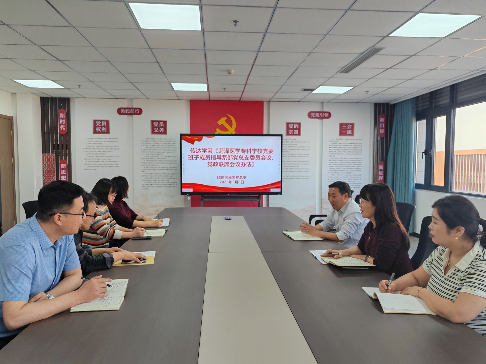 为进一步落实学校党委对系部工作的统筹指导,提升系部党建与行政工作的协同质效,5月8日,临床医学系党总支组织召开专题会议,集中传达学习《菏泽医学专科学校党委班子成员联系指导系部党总支委员会、党政联席会议办法》,系党总支委员、系行政班子成员参加会议。