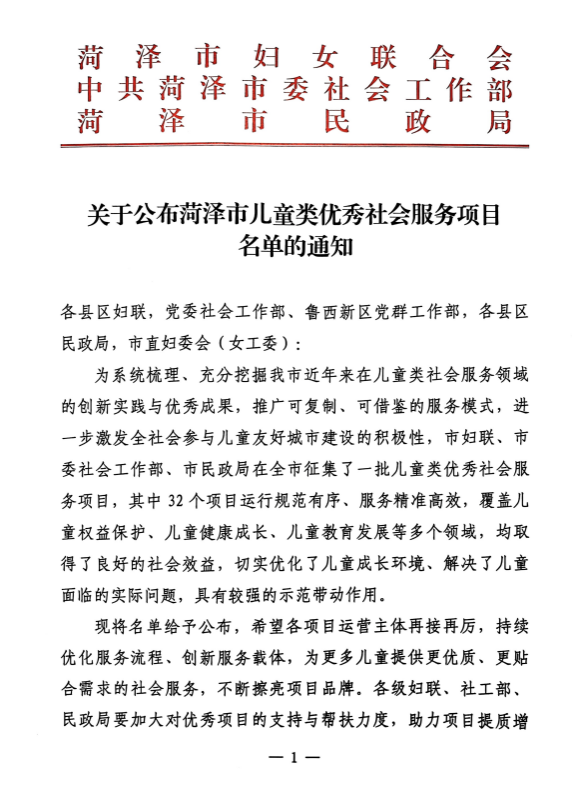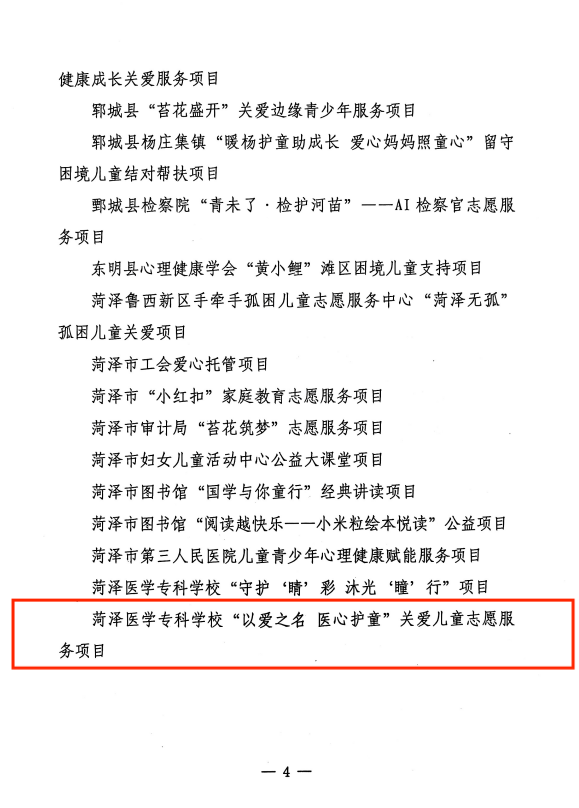 近日,菏泽市妇女联合会等单位联合公布 2025 年儿童类社会服务项目评选结果,临床医学系“以爱之名,医心护童”关爱儿童志愿服务项目凭借扎实的服务成效与鲜明的育人特色,获评“菏泽市儿童类优秀社会服务项目”称号。