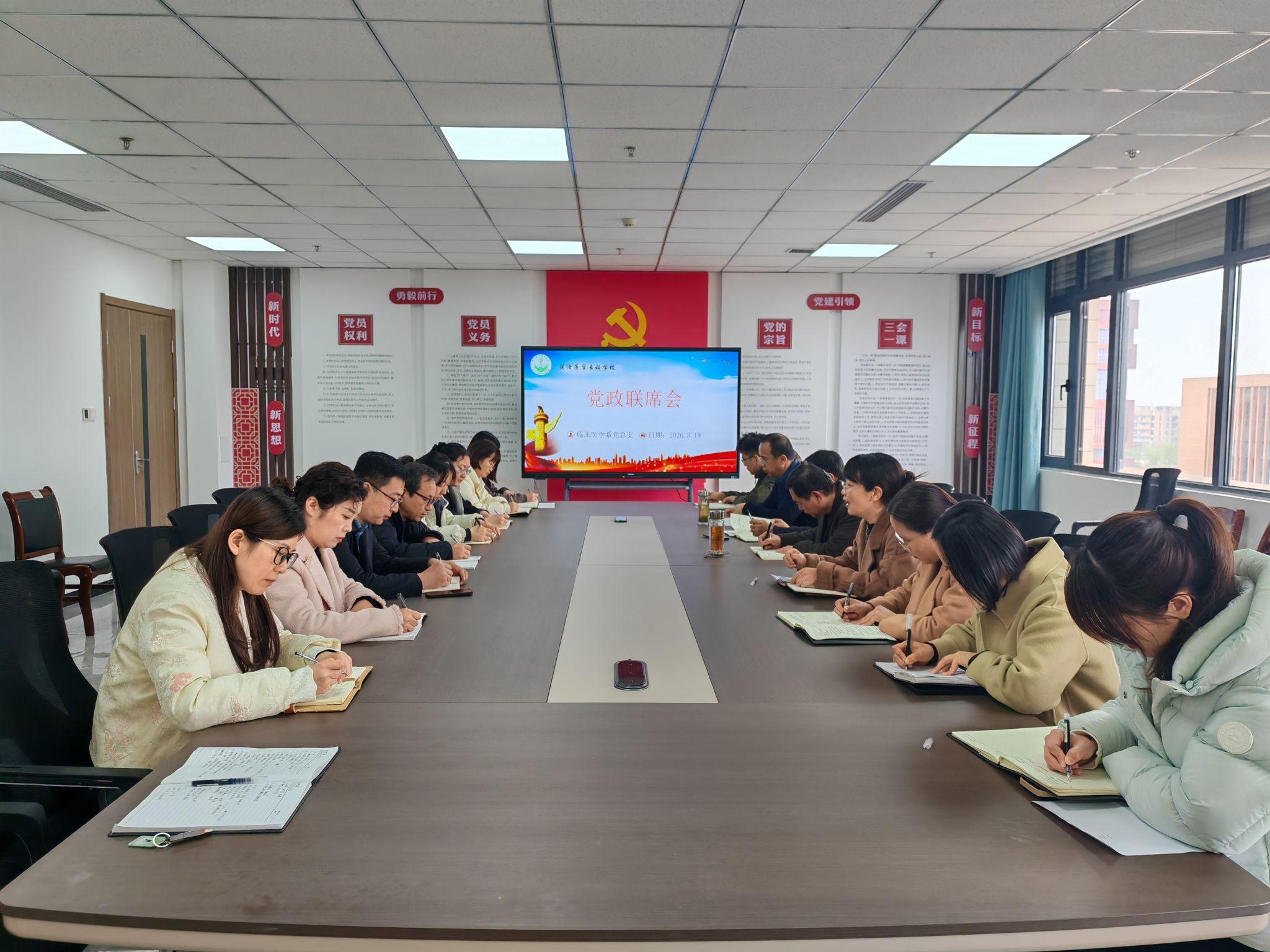 3月19日,临床医学系在3号实训楼5楼党员活动室组织召开党政联席(扩大)会议,深入学习贯彻两会精神,总结回顾前期工作成效,研究部署下一阶段重点任务。校党委副书记蒋继国出席会议并讲话,系党总支书记吴琪主持会议,系部主任赵文星、副主任文兆峰及各科室负责人参会。
