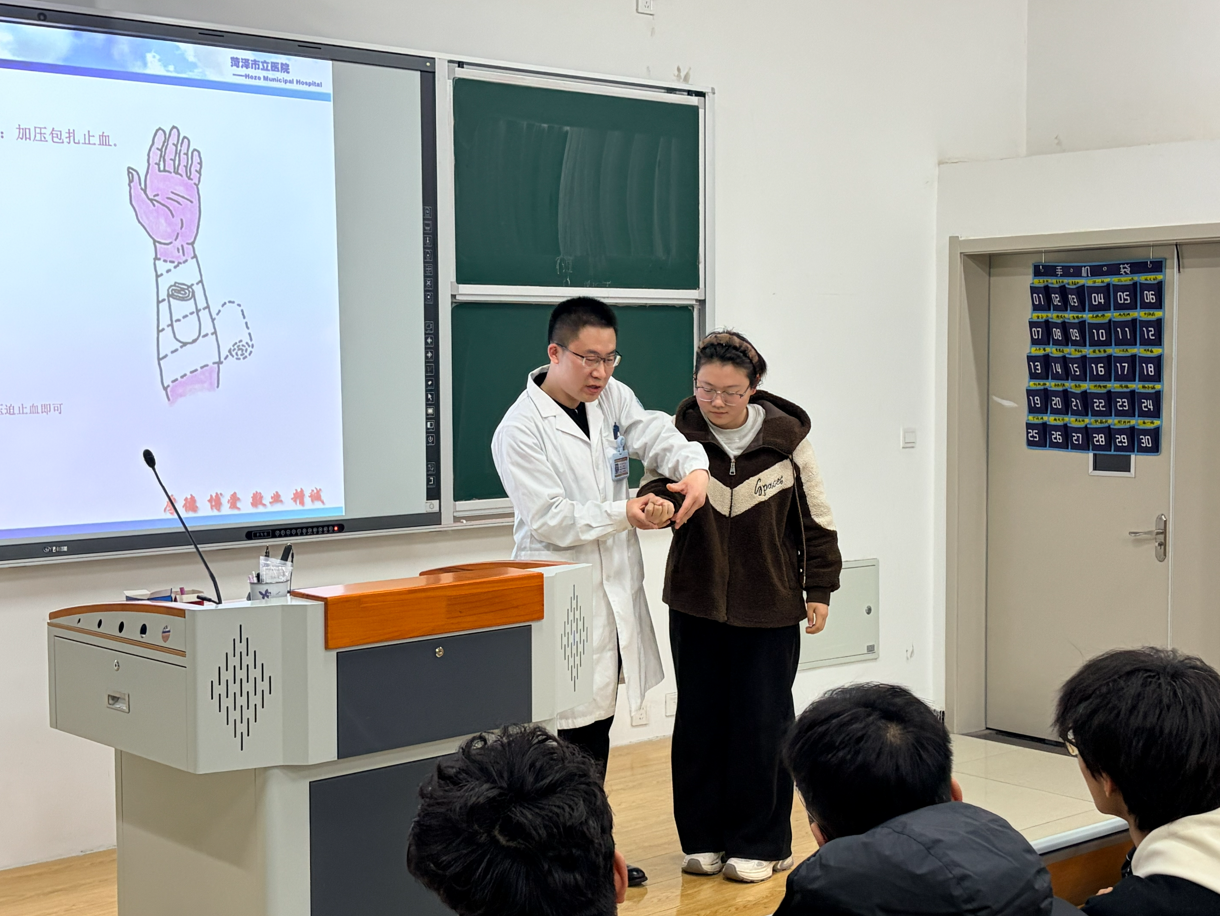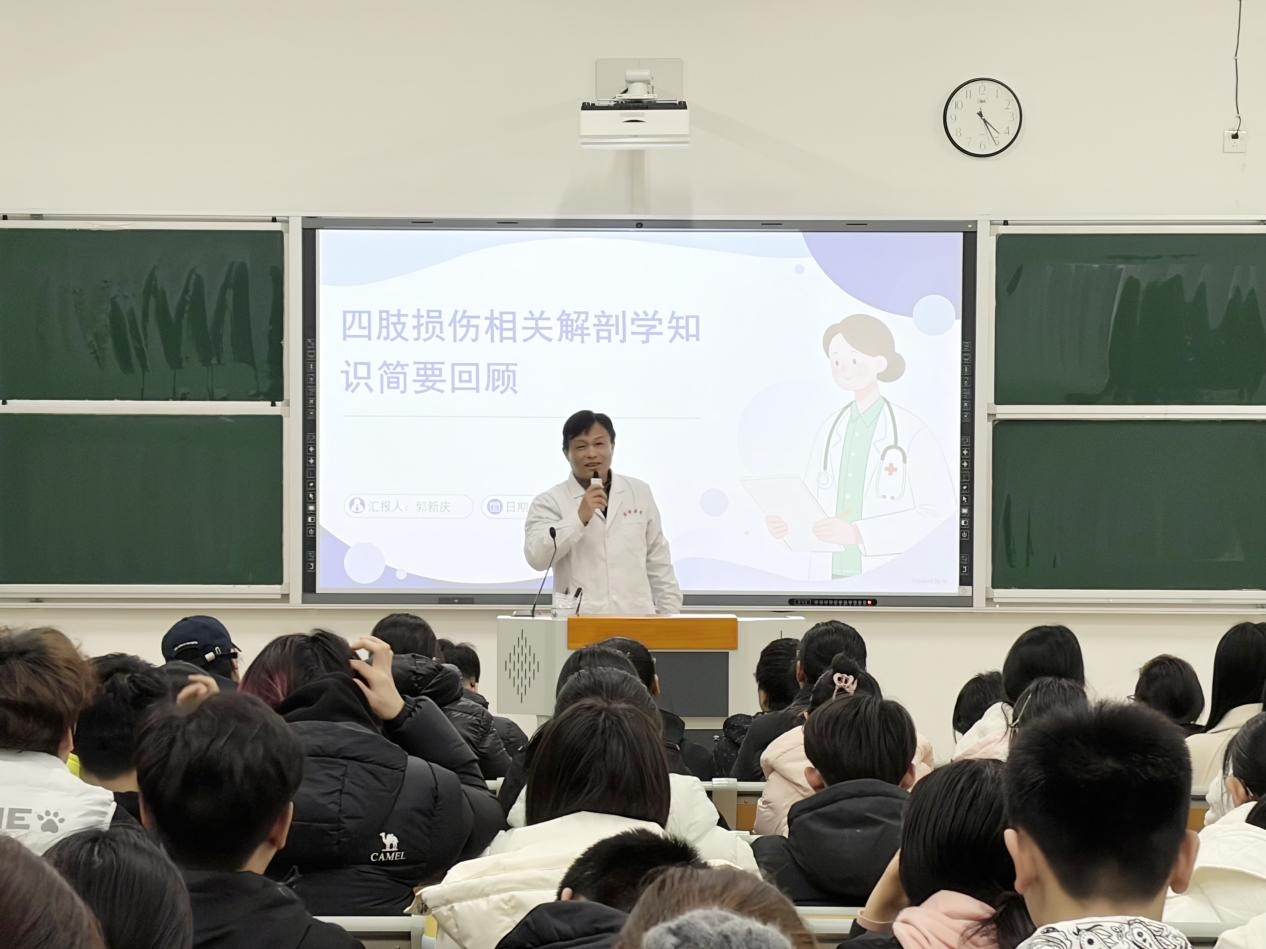 讲座以“四肢损伤”为主题。郭新庆教授系统讲解了四肢骨骼、肌群、神经及血管等关键解剖结构,厘清损伤部位与功能障碍之间的内在联系,帮助学生夯实专业基础。沈明杰副主任医师结合真实病例,分享了四肢损伤的现场急救原则、伤情识别方法与规范处置流程,并从医者情怀出发,引导学生树立敬畏生命、关爱患者的职业理念。
