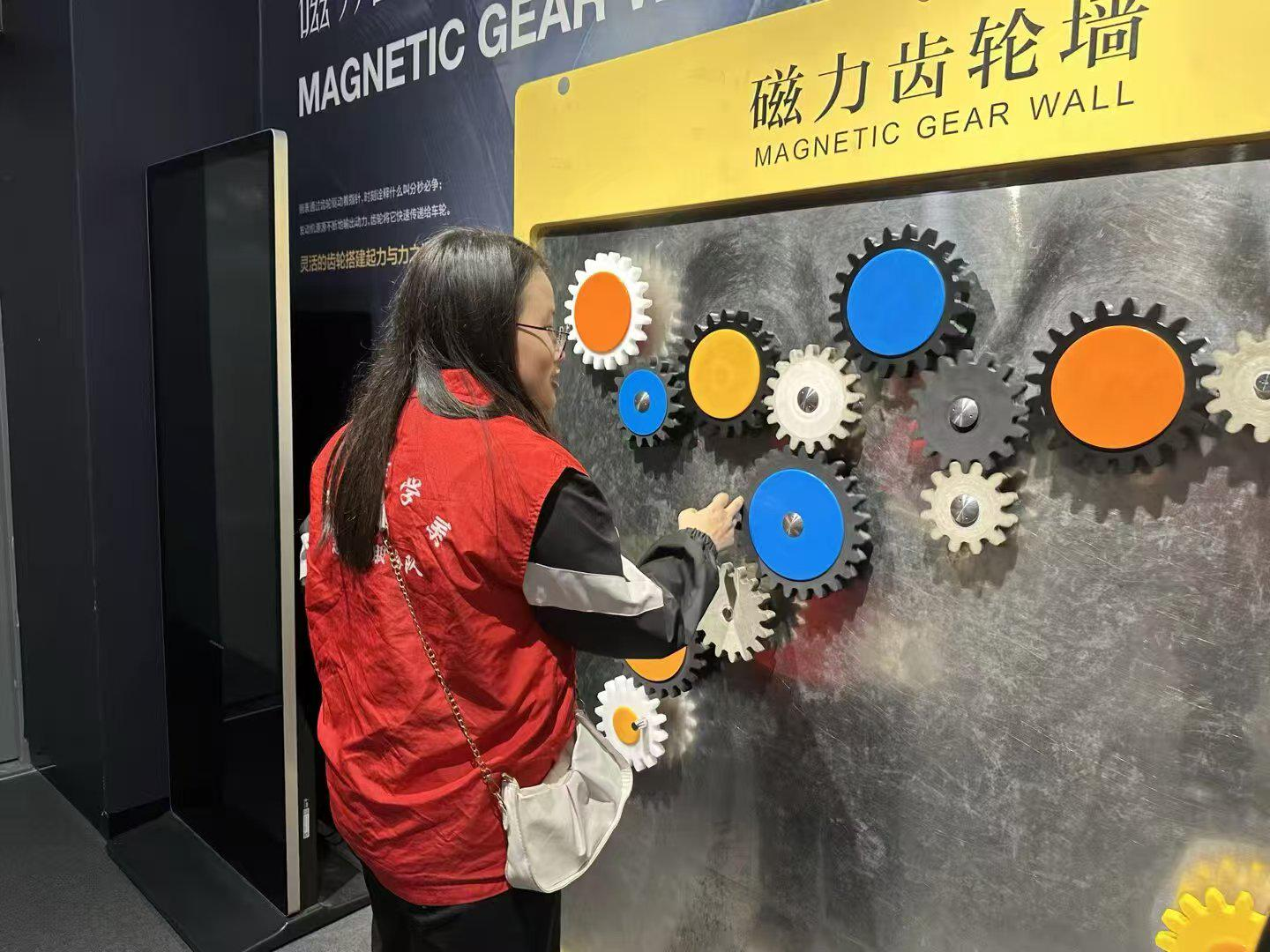 活动伊始,志愿者们先以“学习者”的身份,跟随老师沉浸式参观了科技馆的各个展区。从电磁展台揭示物理奥秘,到人体科学世界展现生命奇迹;与机器人进行趣味互动、虚拟现实中的宇宙“遨游”……前沿的科技展品让人目不暇接,惊叹声此起彼伏。