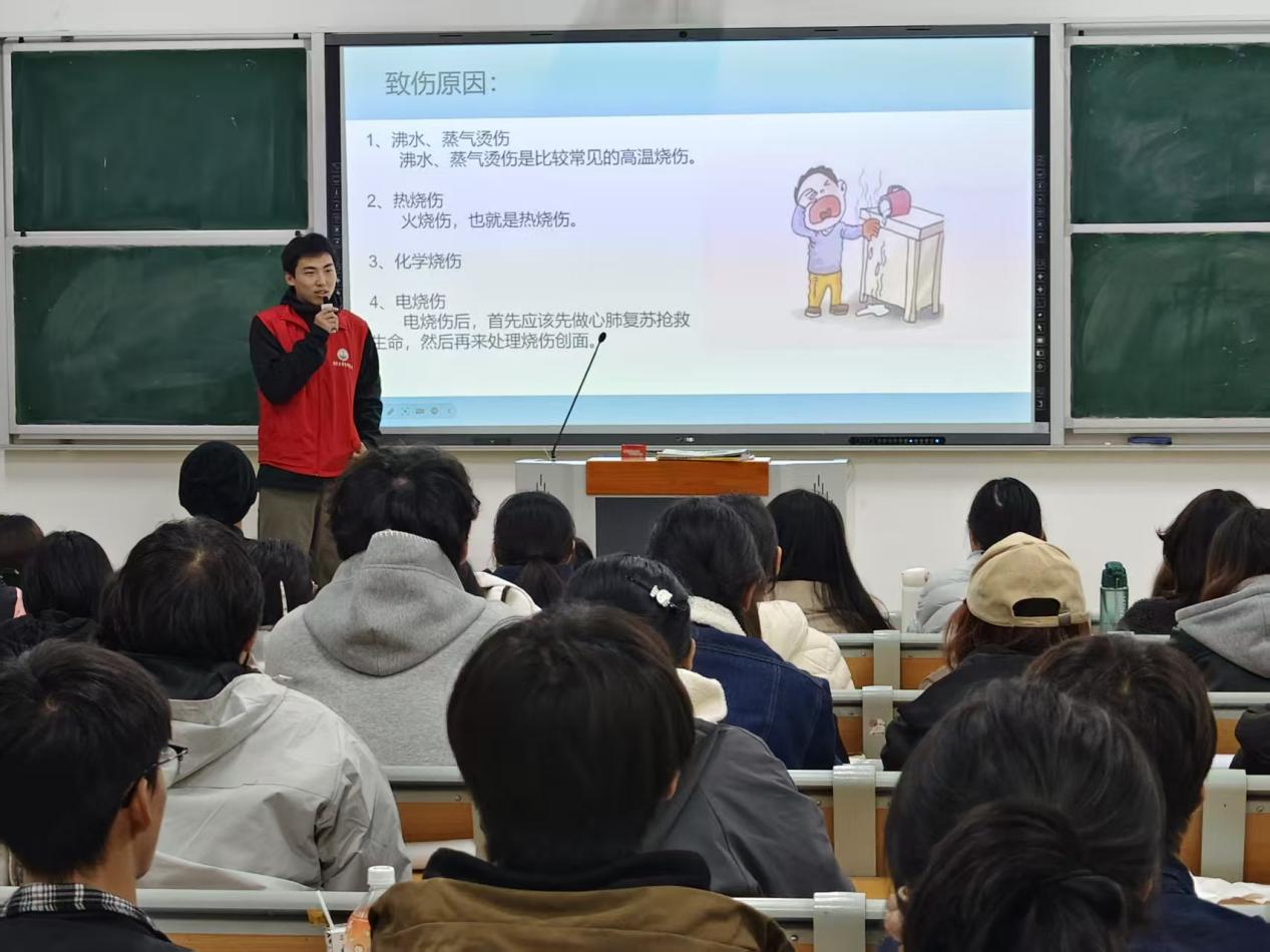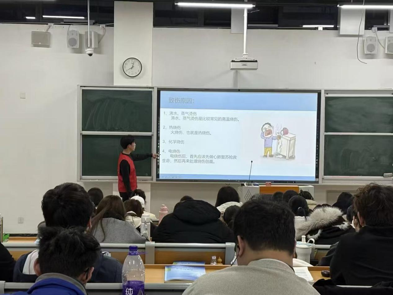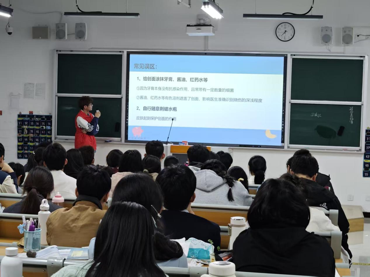 本次活动旨在将专业医学知识转化为普惠学生的安全技能。培训过程中,队员们结合临床医学专业背景,通过生动案例,详细剖析了日常生活中常见的烫伤、烧伤诱因及危害。重点针对“涂牙膏、抹酱油”等错误急救方式进行了科学纠正,并现场传授核心急救原则——“冲、脱、泡、盖、送”五字口诀。队员们语速平缓,指令清晰,确保同学们易懂、易学、易操作。活动现场气氛活跃,队员们耐心解答了大家对伤口处理、日常防护等方面的高频疑问。本次活动共培训学生2000余人,不仅提升了学生的应急避险能力,也展现了临床医学系学子服务同学、奉献社会的责任担当。