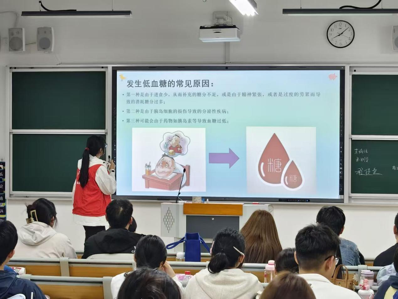 培训过程中,队员们结合临床医学专业背景,通过生动案例详细剖析了低血糖的常见原因、处理方法、疾病表现、主要危害及风险预防,并播放了生动有趣的视频,确保同学们理解更加深刻。队员们语速平缓、指令清晰,确保同学们易懂、易学、易操作。活动现场气氛活跃,队员们耐心解答了大家关于低血糖预防等方面的高频提问。本次活动共培训同学1000余人,不仅提升了同学们的健康防护能力,也展现了临床医学系学子服务同学、奉献社会的责任担当。此次活动是临床医学系学子践行“健康中国”理念、弘扬雷锋精神的生动实践。