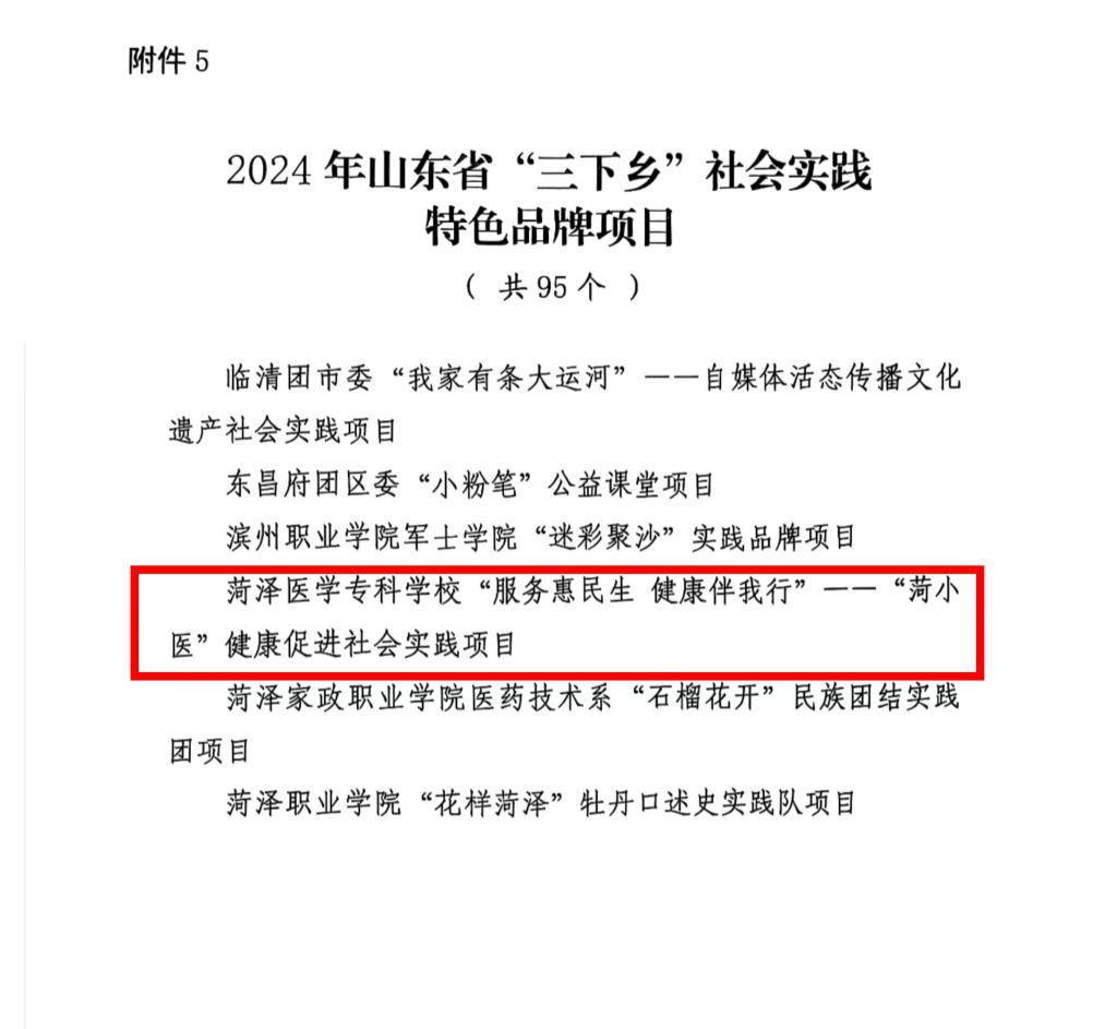 近日,共青团山东省委公布了《关于“调研山东”——2024年山东省大中专学生志愿者暑期“三下乡”社会实践活动的通报》,我校师生荣获多项省级表彰。其中,我校团委获评2024年山东省“三下乡”社会实践优秀组织单位,罗子轩、喻千两位老师获评“优秀指导教师”,王鹤陶、朱鹏岐、徐爱华等十名同学获评“优秀学生”,“医”路向阳三下乡志愿服务队和医心暖乡三下乡服务队获评“优秀实践团队”,“服务惠民生 健康伴我行”—“菏小医”健康促进社会实践项目获评“特色品牌项目”。