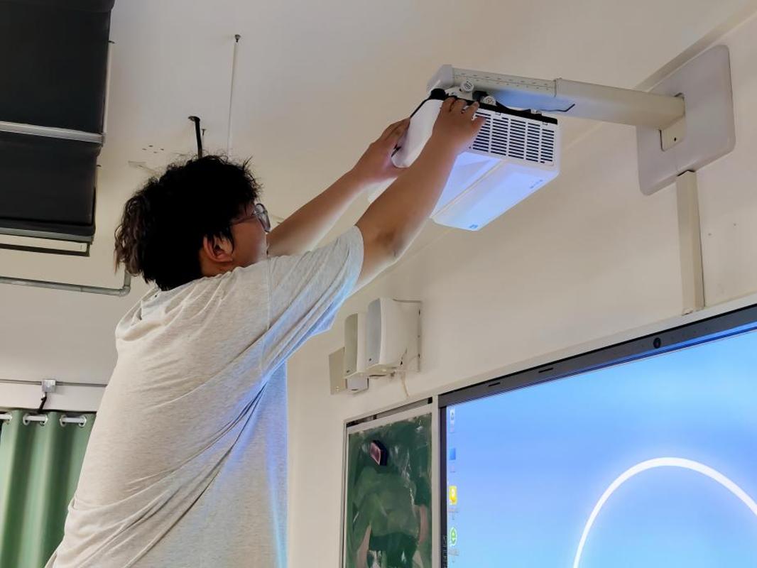 近期,我校部分教室投影仪积灰过多、散热不畅,出现自动关机故障。为此,教育技术科于4月15日至17日,利用课外活动及晚自习时间,组织人员对全校教室投影设备开展了全面清灰除尘工作。重点清理了投影仪滤网、散热风扇及出风通道等关键部位,确保散热通畅;同时检查了电源线路及程序设置,从软硬件两方面排除潜在隐患。