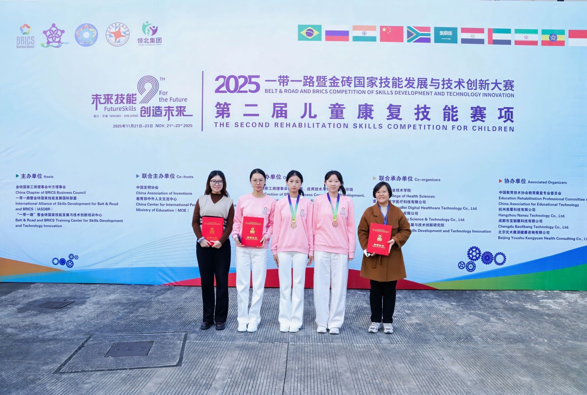 11月21日至23日,2025一带一路暨金砖国家技能发展与技术创新大赛儿童康复技能赛项总决赛在宁波圆满落幕,我校康复治疗技术专业学生陈姝灿和耿雅如分别荣获二等奖、三等奖,周蕊老师荣获优秀指导教师奖,我校同时获优秀组织奖。